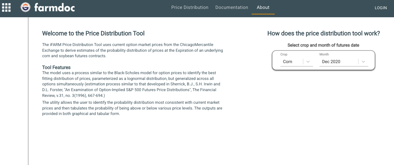 The Illinois Price Distribution Tool, by farmdoc, uses current option market prices to derive estimates of prices at the expiration of an underlying corn and soybean futures contracts.