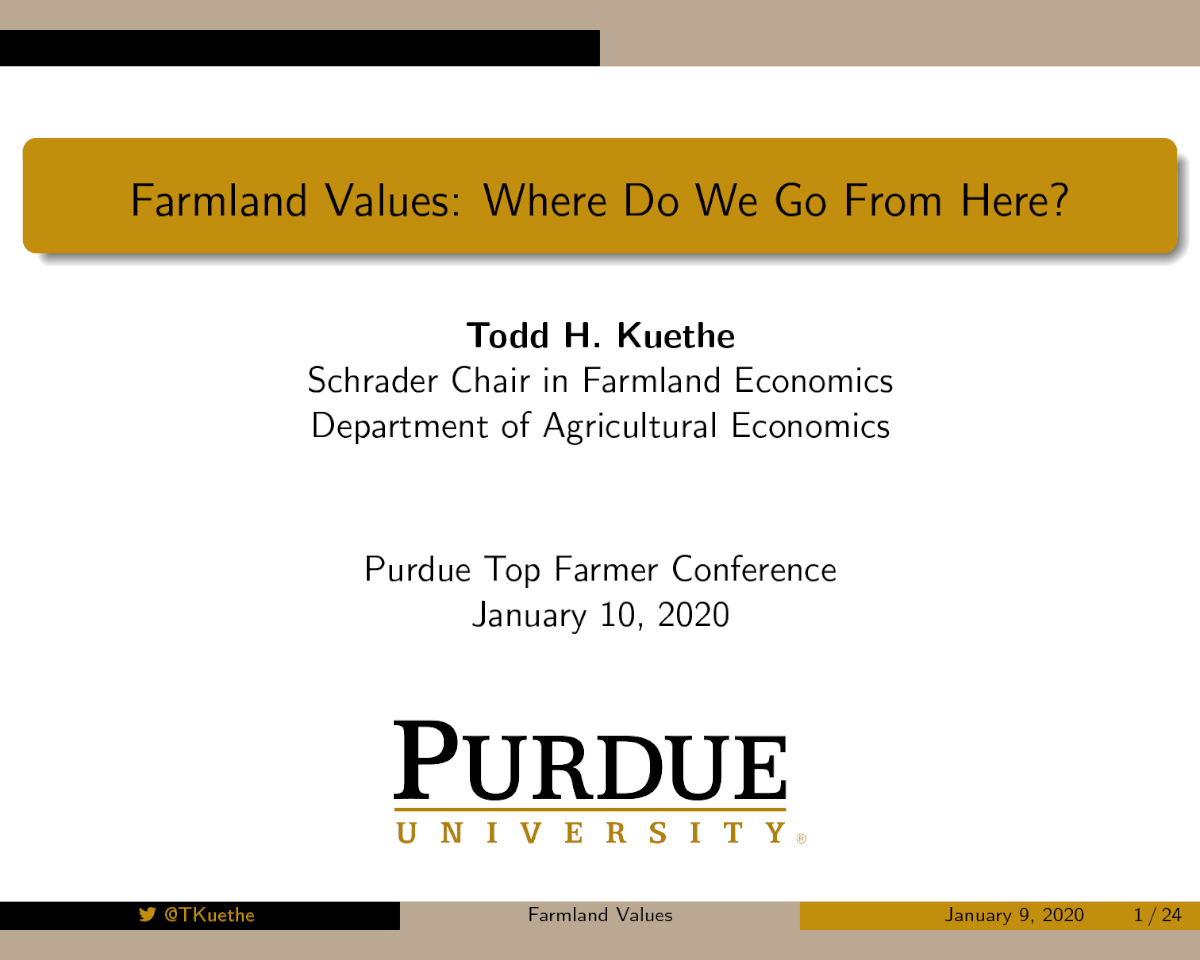 Top Farmer Conference slidedeck presentation by Todd Kuethe, Associate Professor, Schrader Endowed Chair in Farmland Economics, Explore recent trends in farmland markets in Indiana and across the Corn Belt and closely examine returns to farmland, the cost of capital, and both the short-run and long-term prospects for farmland prices.