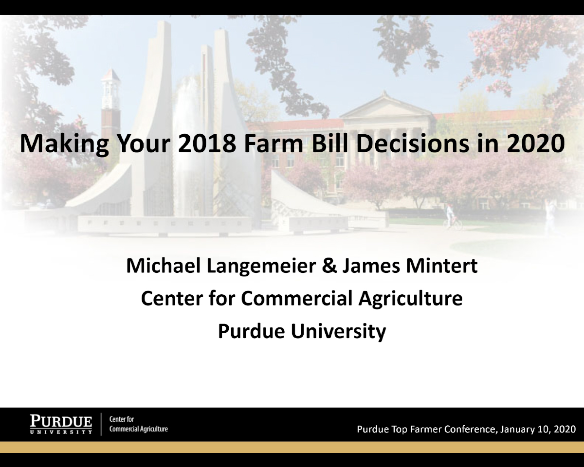 Top Farmer Conference slidedeck presentation by Michael Langemeier and James Mintert, Professors of Agricultural Economics, Purdue University. The 2018 Farm Bill presents producers with several choices to be made by the March 15 sign-up deadline. This session discussed the alternatives and will help you choose between the ARC and PLC programs.