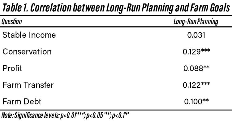 Table 1 presents the correlations between long-run planning and each farm goal. Long-run planning was significant and positively related to conservation and farm transfer at the 1% level, and significant and positively related to profit maximization and the reduction in farm debt at the 5% level. Thus, prioritization of long-run planning is related to multiple farm goals.