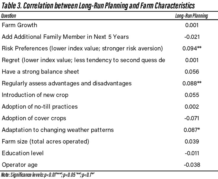 Correlations between long-run planning and selected farm characteristics are displayed in table 3. A positive and significant correlation was found between long-run planning and risk preferences. Among respondents prioritizing short-term goals, 35.0% were classified as less risk averse, compared to 45.1% of those prioritizing long-run goals. This indicates that operators that were less risk averse tended to focus more on long-run planning. The correlation between long-run planning and agility (i.e., assessment of advantages and disadvantages) was positive and significant at 5% level of significance. Among respondents with short-term priorities, 61.7% reported regularly assessing their advantages and disadvantages, compared to 76.5% of those with long-term priorities. This underscores that farms with long-term sustainability preferences are more likely to evaluate their advantages and disadvantages than those focused on short-term goals. Likewise, the association between long-run planning and adaptation to changing weather patterns was positive and significant at the 10% level. In terms of adapting to changes in weather patterns, respondents were given the following choices: installed tile drainage, installed irrigation, planted cover crops, changed crop mix, adopted no-till, changed crop varieties, and changed planting dates. Approximately 27% of the respondents answered this question affirmatively. The three most common changes, in order, were changed planting dates, installed tile drainage, and changed crop varieties.