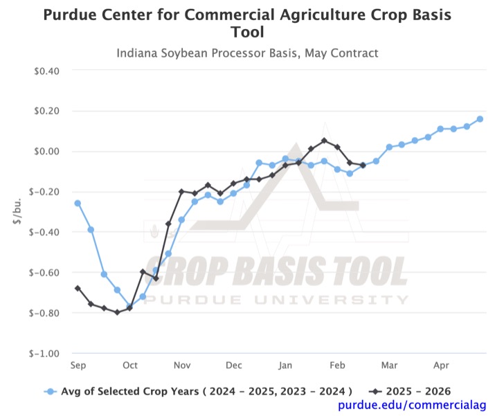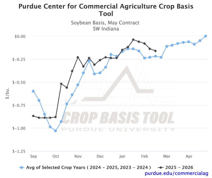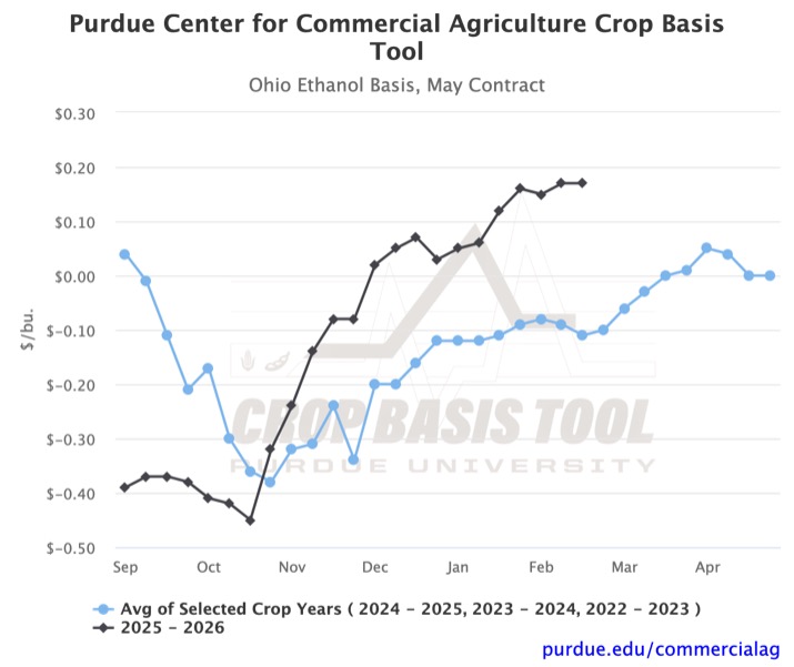 You can visit the Purdue Center for Commercial Agriculture’s Crop Basis Tool to see what ethanol or soybean crushing basis looks like in your state. You can also explore your district-level corn or soybean basis to all unexpired futures contracts in the 2025-2026 marketing year. In addition to the historical average, it may be insightful to examine the basis for previous years individually when the current marketing year significantly diverges from the average.