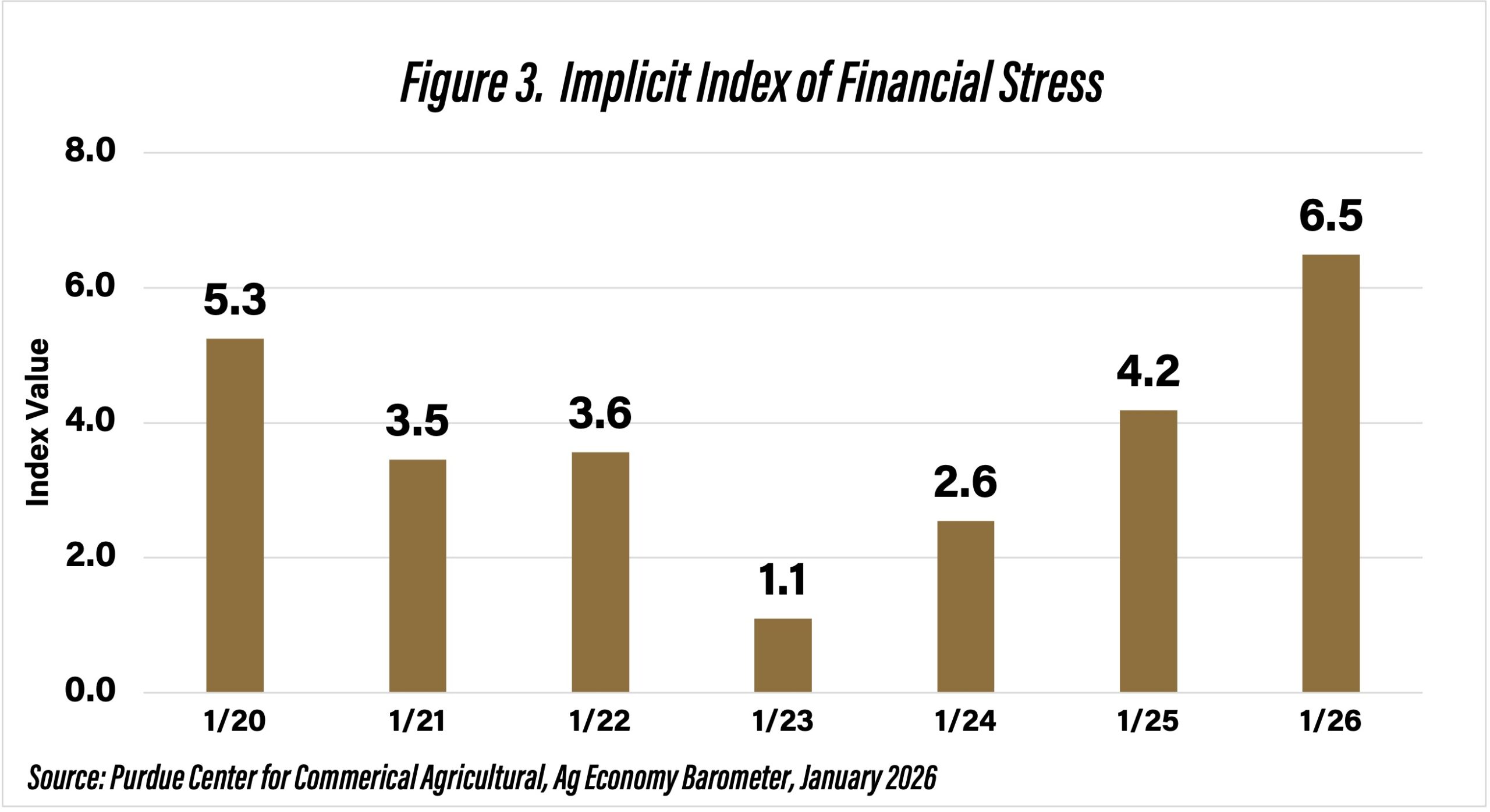 We can derive an implicit index of financial stress by multiplying the percentage of respondents with larger operating loans by the percentage of respondents that chose “unpaid operating debt from prior years” as their primary reason for having a larger operating loan. The resulting index is illustrated in Figure 3. This index ranged from a low of 1.1 in 2023 to 6.5 in 2026. Thus, the index in 2026 was higher than it was in 2020, which followed the 2014 to 2019 period of relatively low net returns.