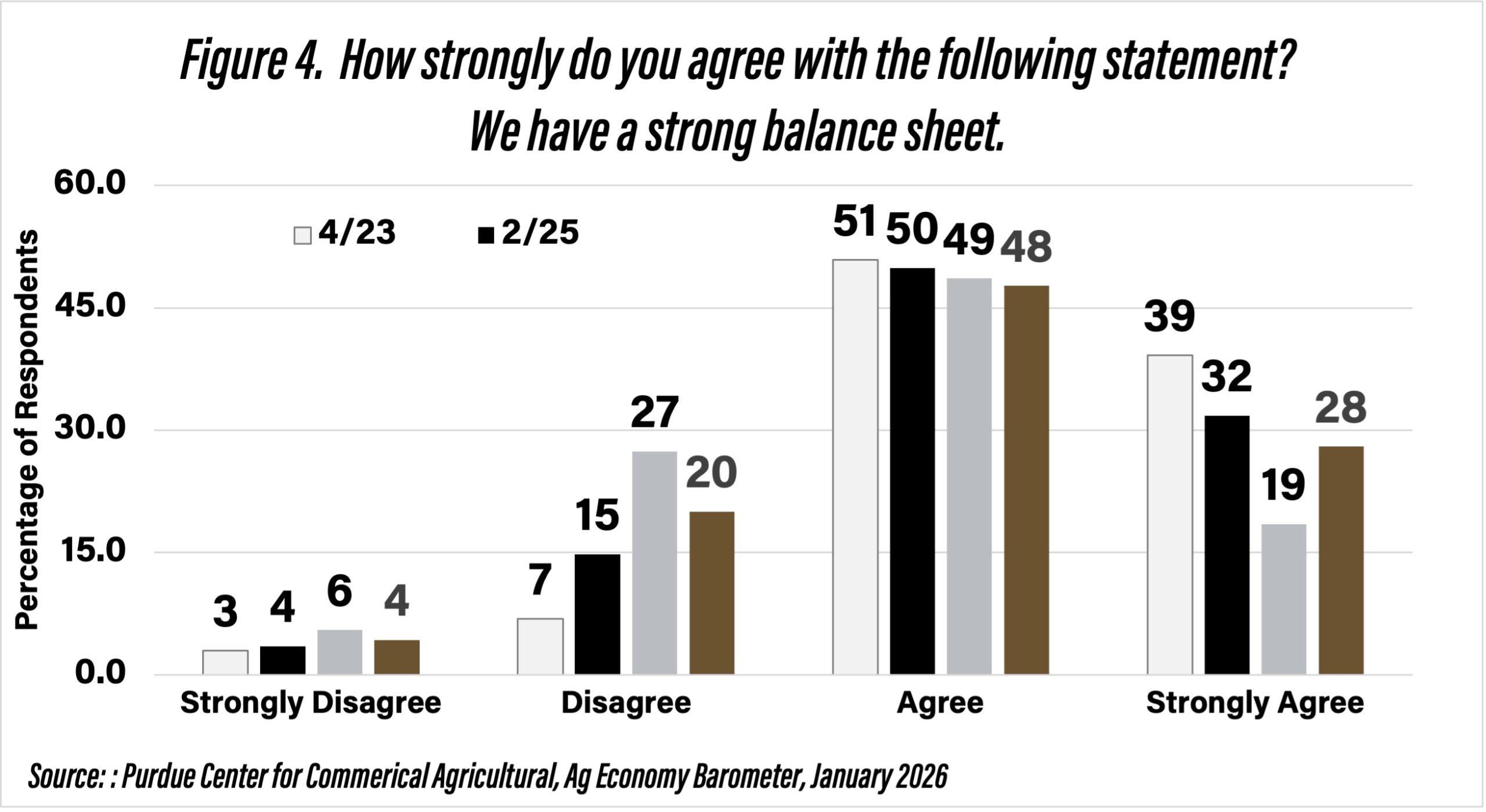Periodically, AEB surveys gauge the strength of individual respondent’s balance sheet. In January 2026, 76% of the respondents agreed and strongly agreed that they had a strong balance sheet. As a reference point, this percentage was 90% in April 2023, suggesting some weakening in financial positions more recently, despite federal assistance payments that have supported farm income.