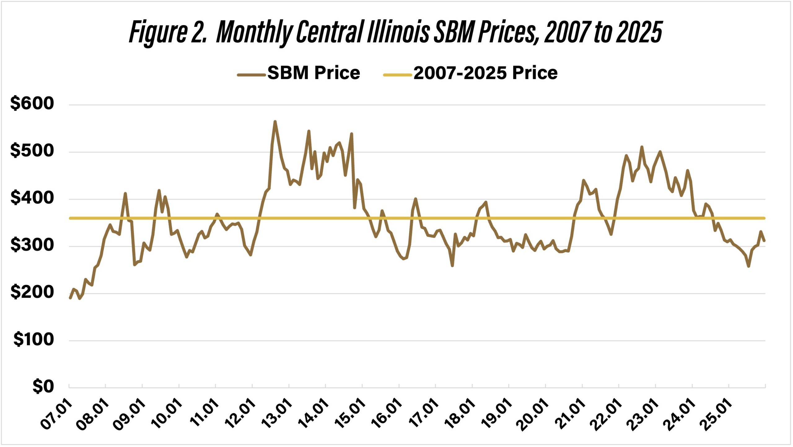 Figures 1 and 2 report monthly corn and soybean meal prices from January 2007 to December 2025. Corn prices averaged $4.71 per bushel from 2007 to the current month. Soybean meal price averaged $360 per ton from 2007 to the current month. Current corn and soybean meal prices are below the long-run averages. Futures prices suggest that corn and soybean meal prices are likely to remain below their long-run averages well into next year. The impact of these corn and soybean meal projections on feed costs is discussed below.
