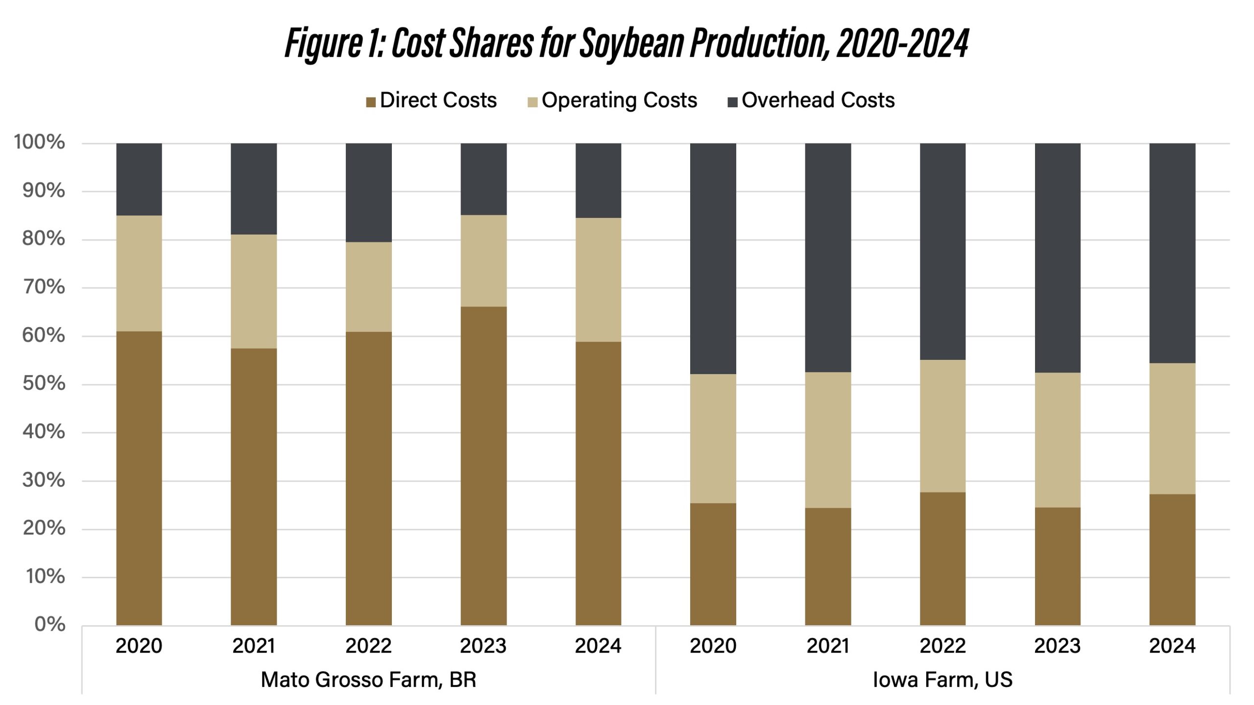 This article compares the economics of soybean production in two major producing regions in the United States and Brazil over the 2020–2024 period. The results show some structural differences in soybean production systems in the American and Brazilian farms. While Brazil’s cost structure is heavily influenced by input-intensive tropical agriculture and dependence on imported fertilizers, the United States faces higher overhead costs driven primarily by elevated land values.