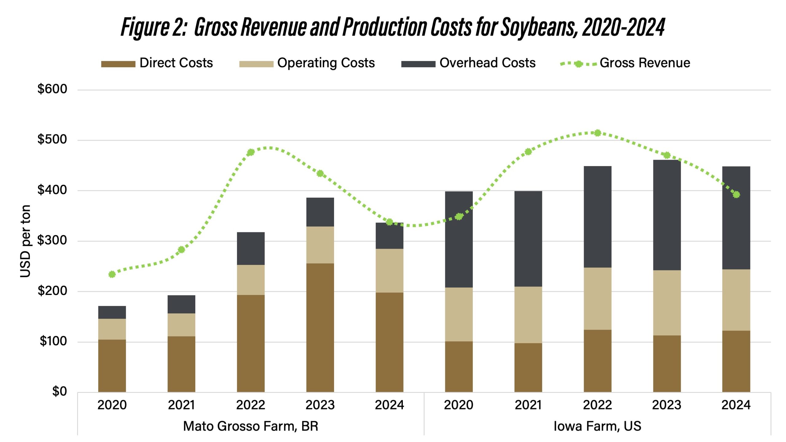 Although Brazil had significant cost increases between 2021 and 2022, strong soybean prices, local currency depreciation, and robust export demand helped sustain profitability during that period. Meanwhile, U.S. soybean production generated strong margins in 2021 and 2022 but faced tighter or negative margins in other years, reflecting rising operating costs, high fixed land expenses, and sensitivity to market price fluctuations.