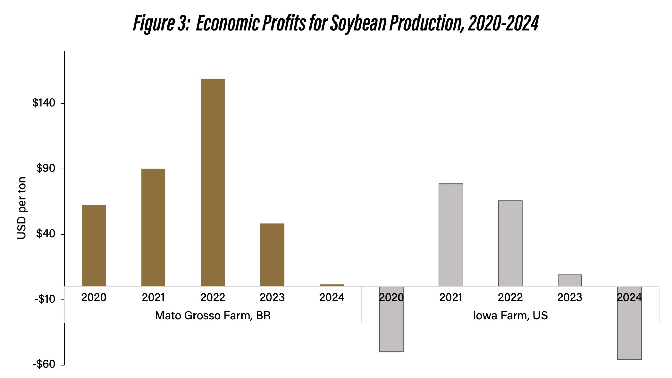 Despite rising production costs, soybean gross revenue generally outpaced or kept pace with costs after 2020 on the Brazilian typical farm analyzed, supported by higher soybean prices. The same did not occur on the U.S. farm. Based on the difference between revenues and total production costs (direct, operating, and overhead), Figure 3 presents economic profits for soybean production on representative farms in Mato Grosso and Iowa from 2020 to 2024.