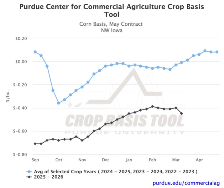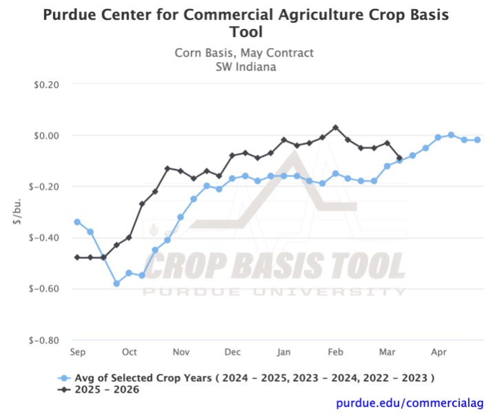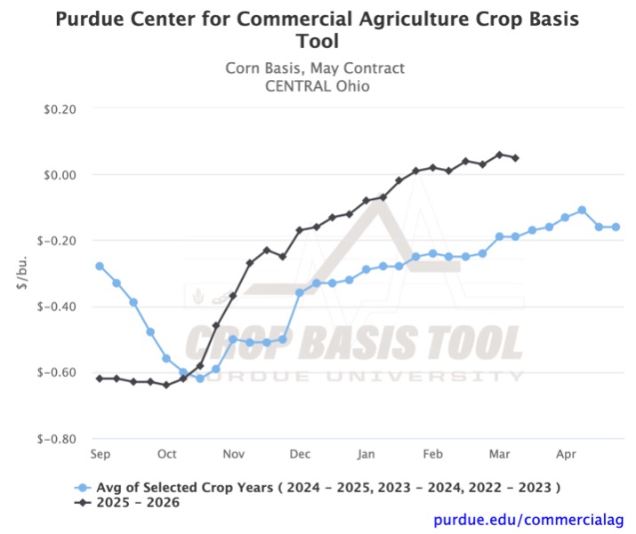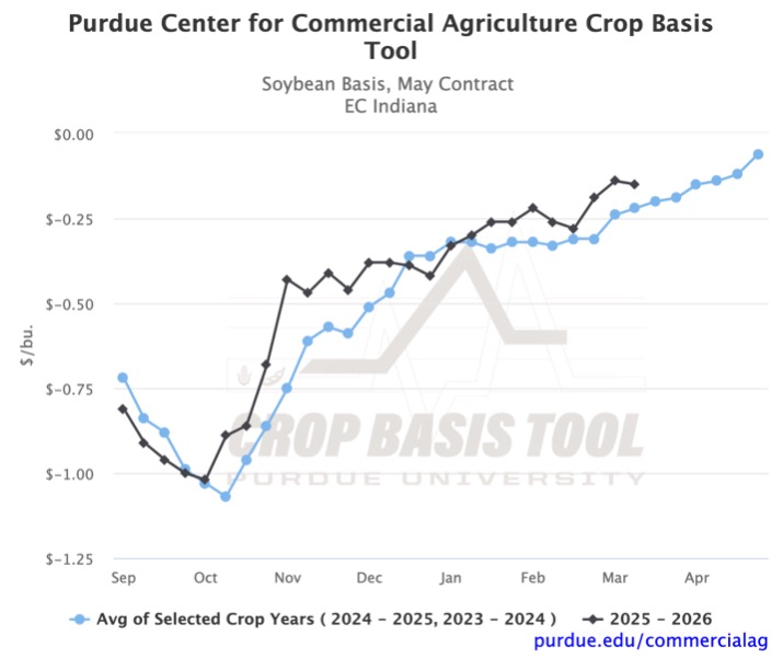 Looking ahead to next month, the historical trend suggests a basis strengthening. However, recent trends have diverged. There have been significant week-to-week decreases across the region, which are uncommon according to the graphs. This volatility is a reminder to stay up to date with your local basis levels. You can visit the Purdue Center for Commercial Agriculture’s Crop Basis Tool to do so.