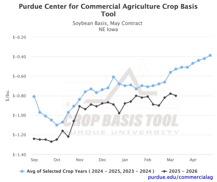 While the month-to-month corn basis has stayed stable, the local soybean basis has been more volatile. This has led to the current soybean basis exceeding February’s level, with notable strengthening across the region. Over the past month, soybean basis rose by $0.13/bu in East Central Indiana and $0.10/bu in Northeastern Iowa (Figures 5 and 6). The month-over-month increase was mainly driven by a strengthening in the last week of February. However, in the past week, basis movement turned negative region-wide. Only two CRDs across the five states showed further strengthening between the first and second weeks of March.