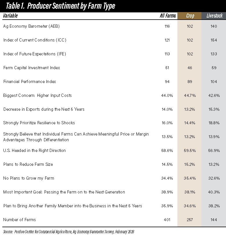 While U.S. livestock producers have benefited from stronger market conditions, crop producers continue to face tighter margins. Results from the February 2026 Purdue University-CME Group Ag Economy Barometer (AEB) survey provide insight into how these differences are influencing producer sentiment, growth expectations, and transition plans by farm type. The AEB index is computed monthly to gauge sentiment among approximately 400 U.S. agricultural producers (Langemeier and Colussi, 2026).