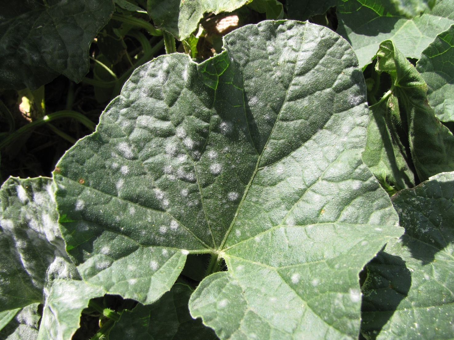 Figure 1. Colonies of powdery mildew are visible on the upper surface of this cantaloupe leaf.