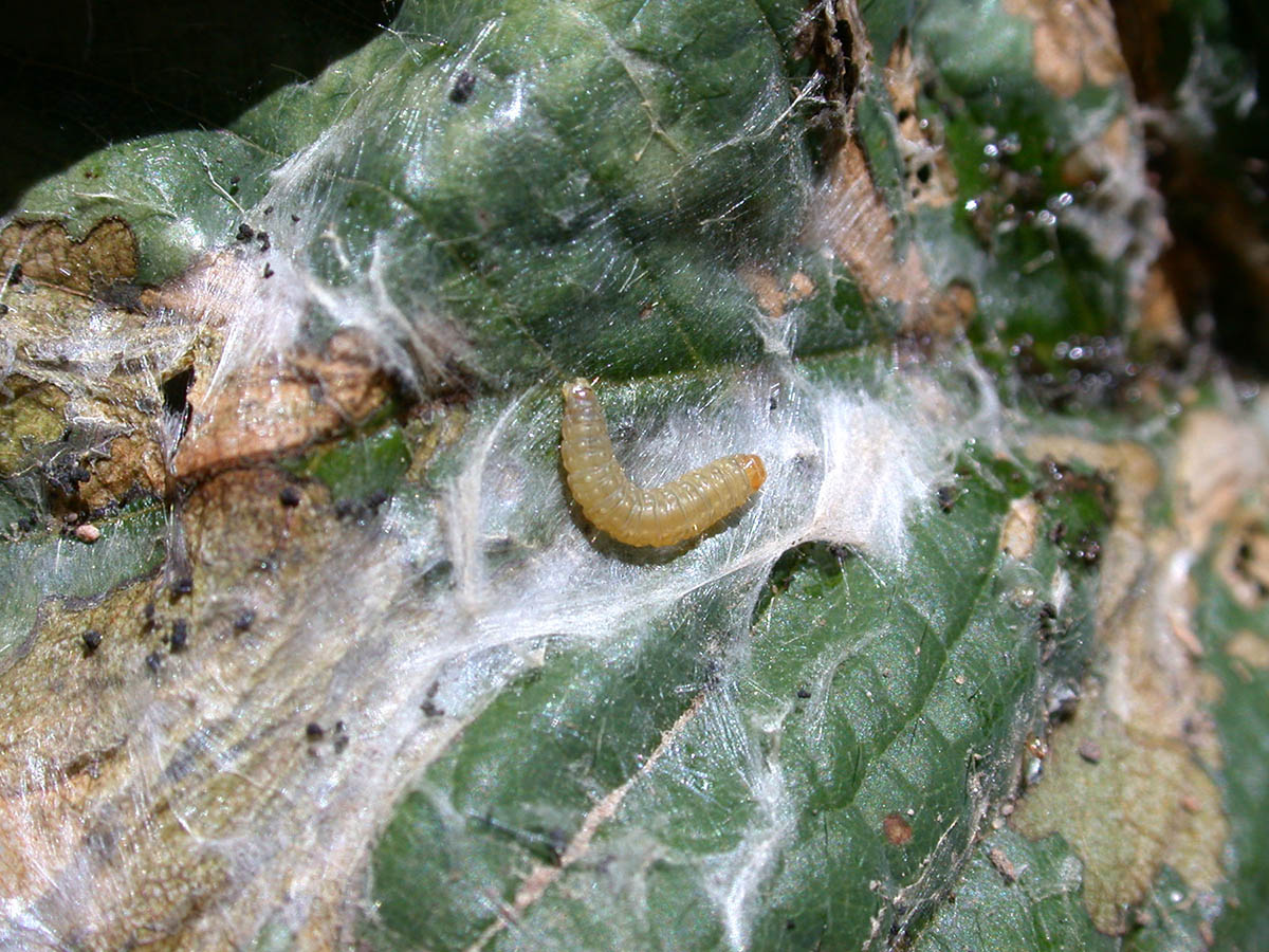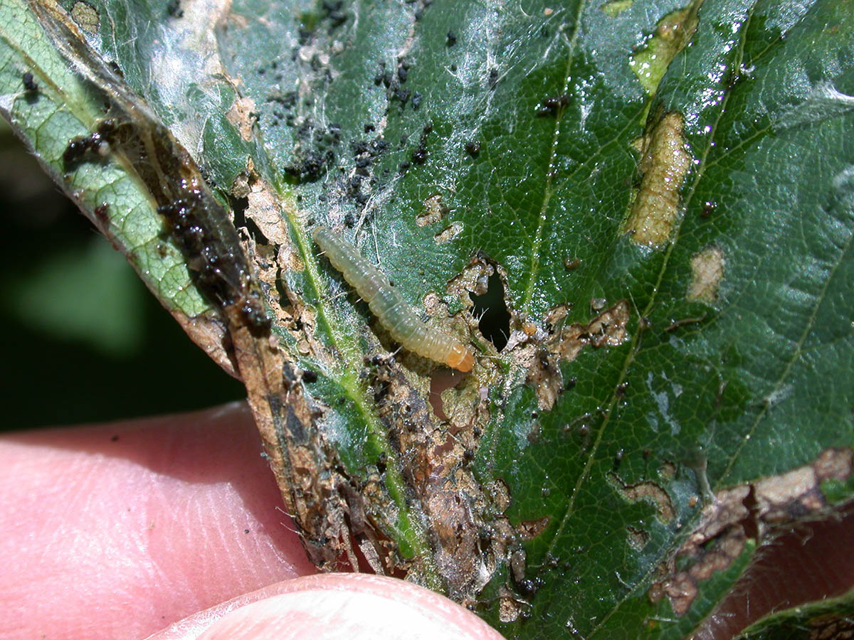 Strawberry leaf roller larva webbing exposed