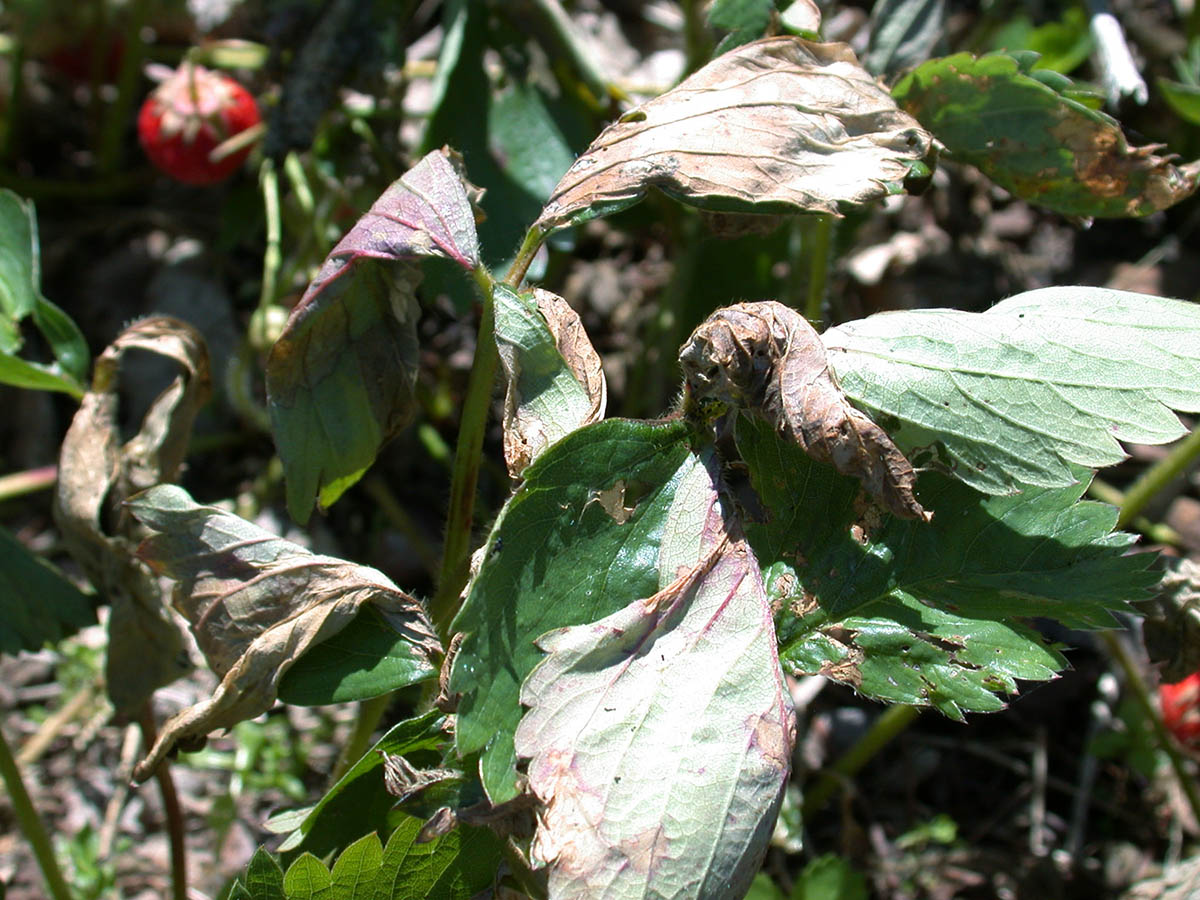 Strawberry leaf roller damage on leaves