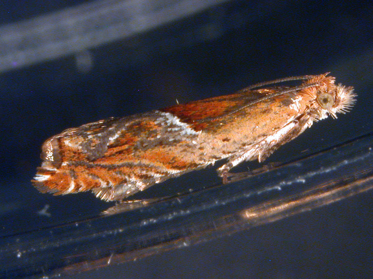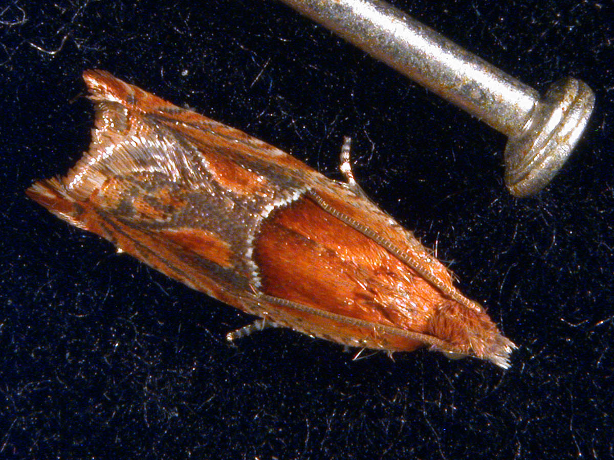 Strawberry leaf roller moth next to pin head
