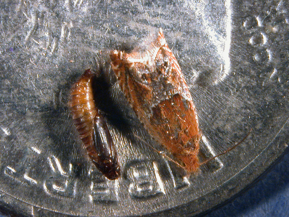 Strawberry leaf roller moth and pupa on a dime