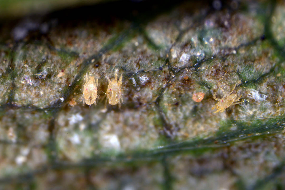 Two-spotted spider mites on strawberry leaf