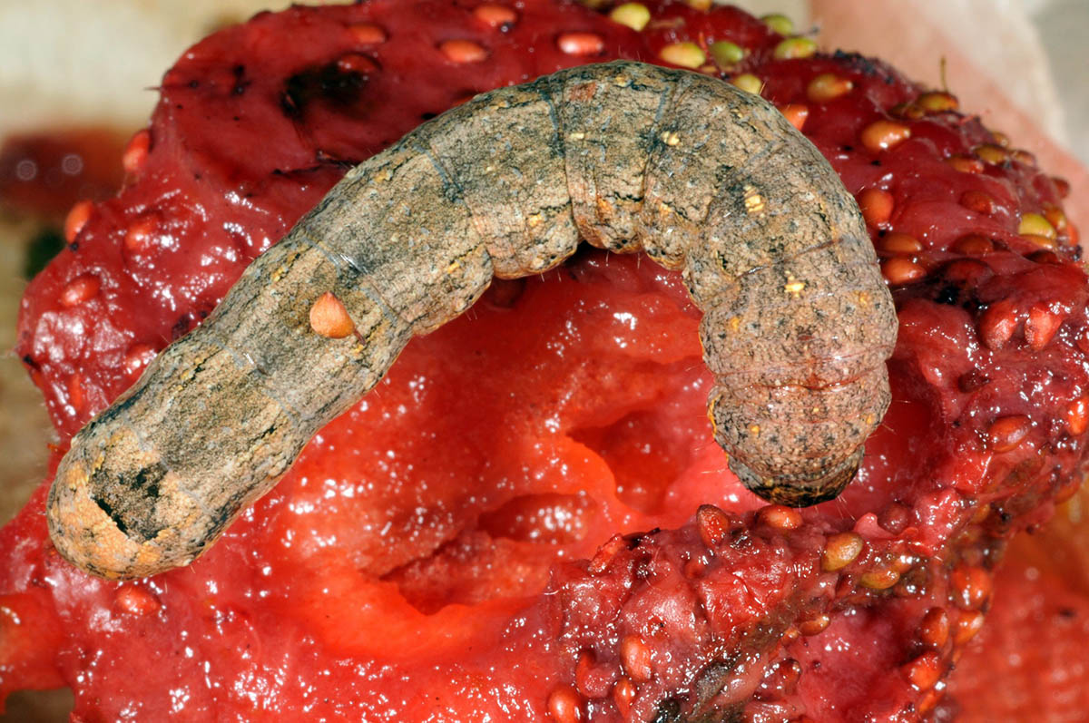 Variegated cutworm larva on strawberry (close)