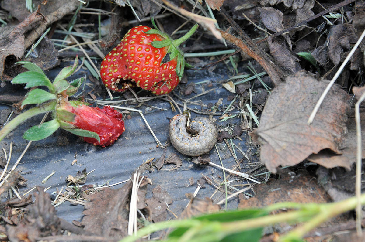 Variegated cutworm larva next to damaged strawberries