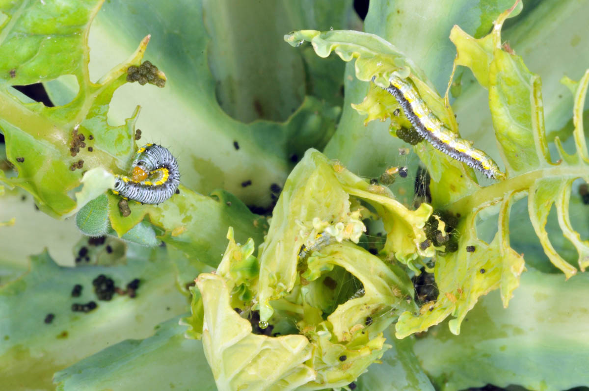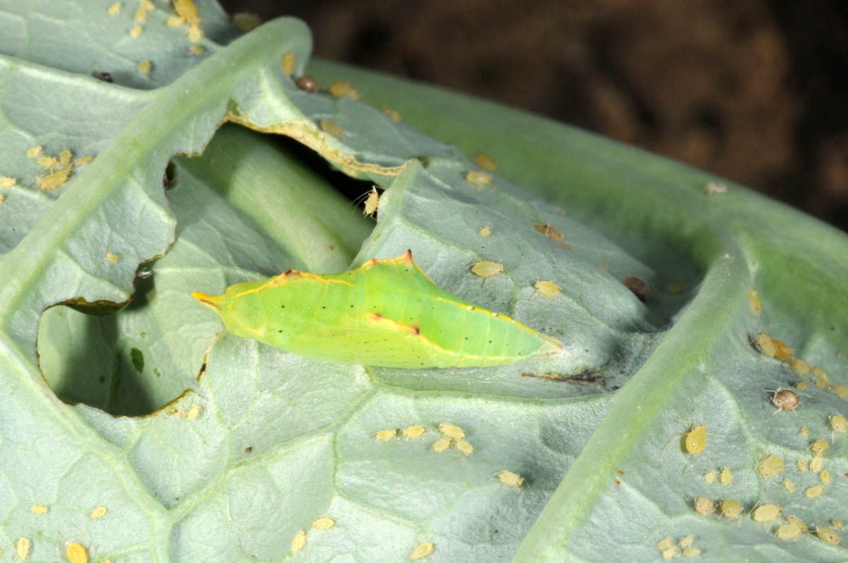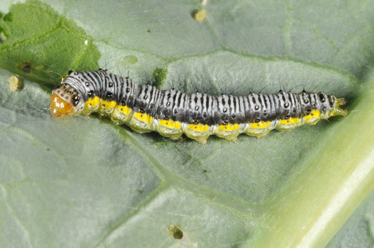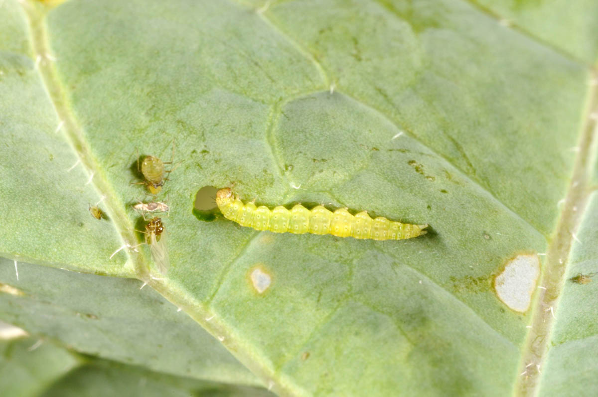 Diamond black moth larva and aphids feeding on cabbage leaf