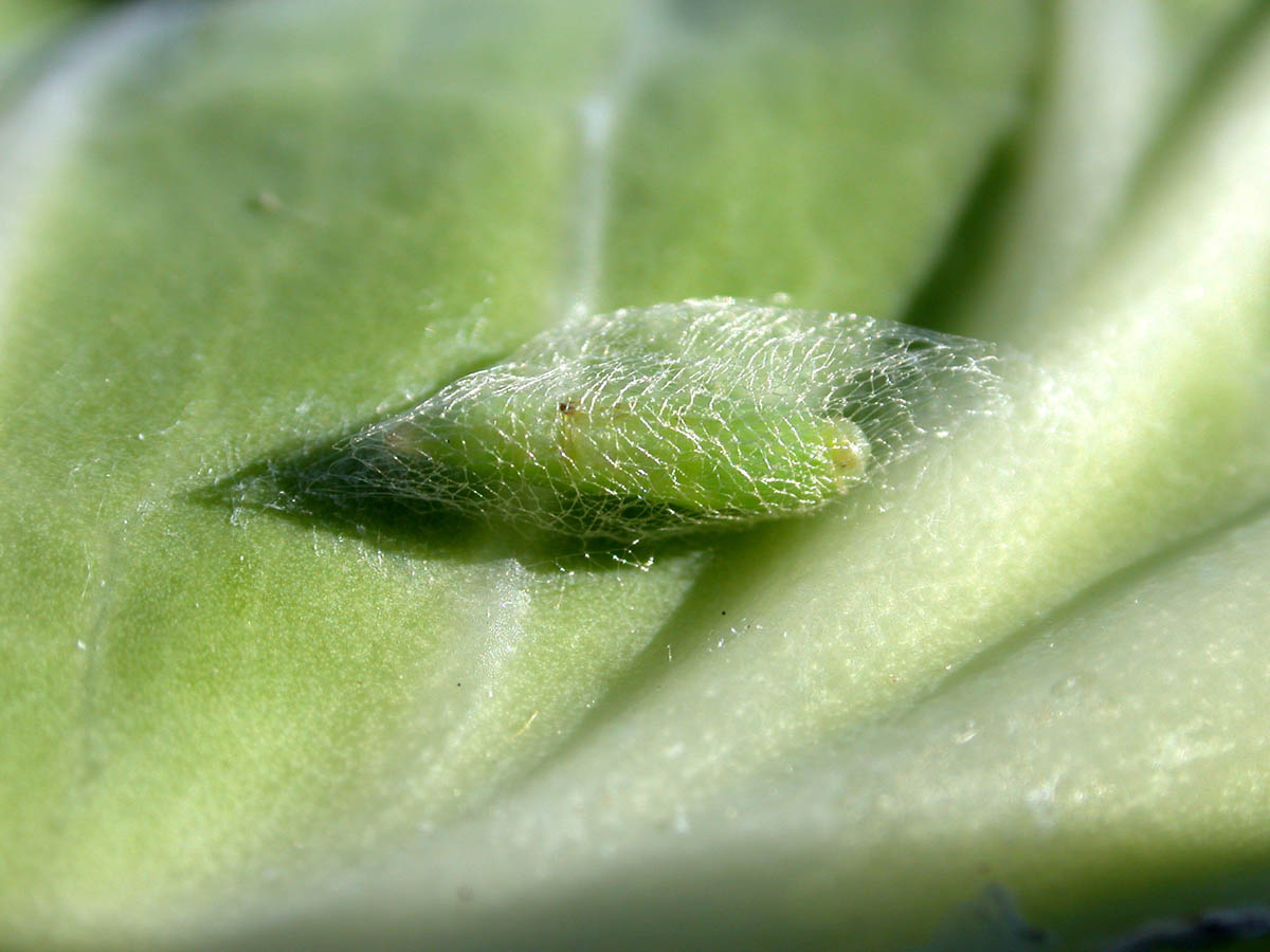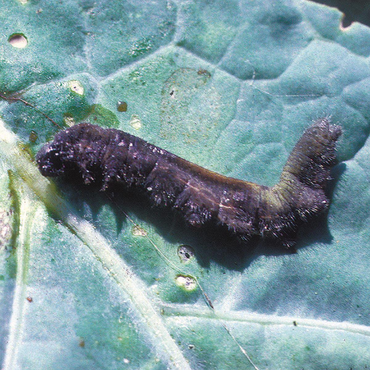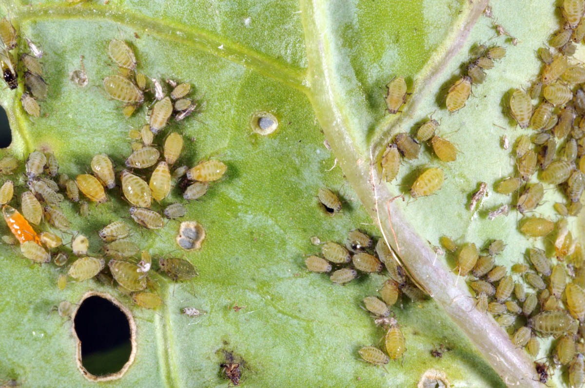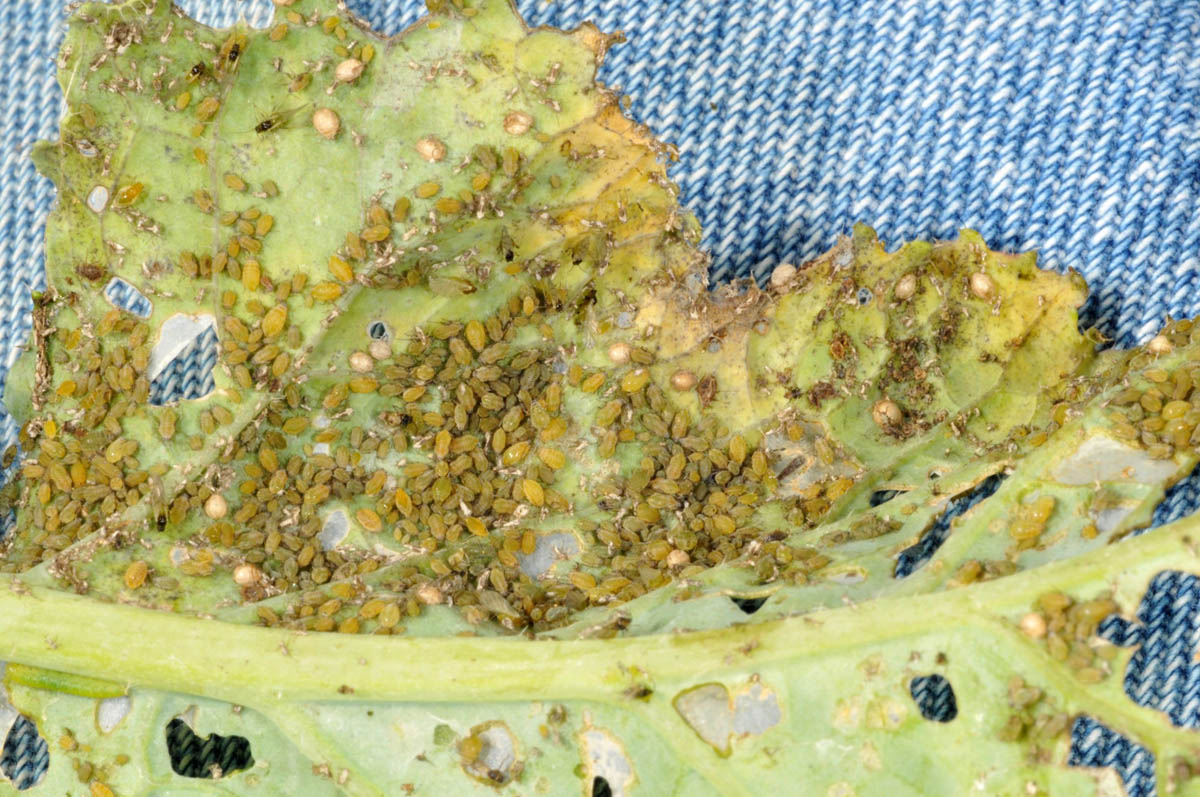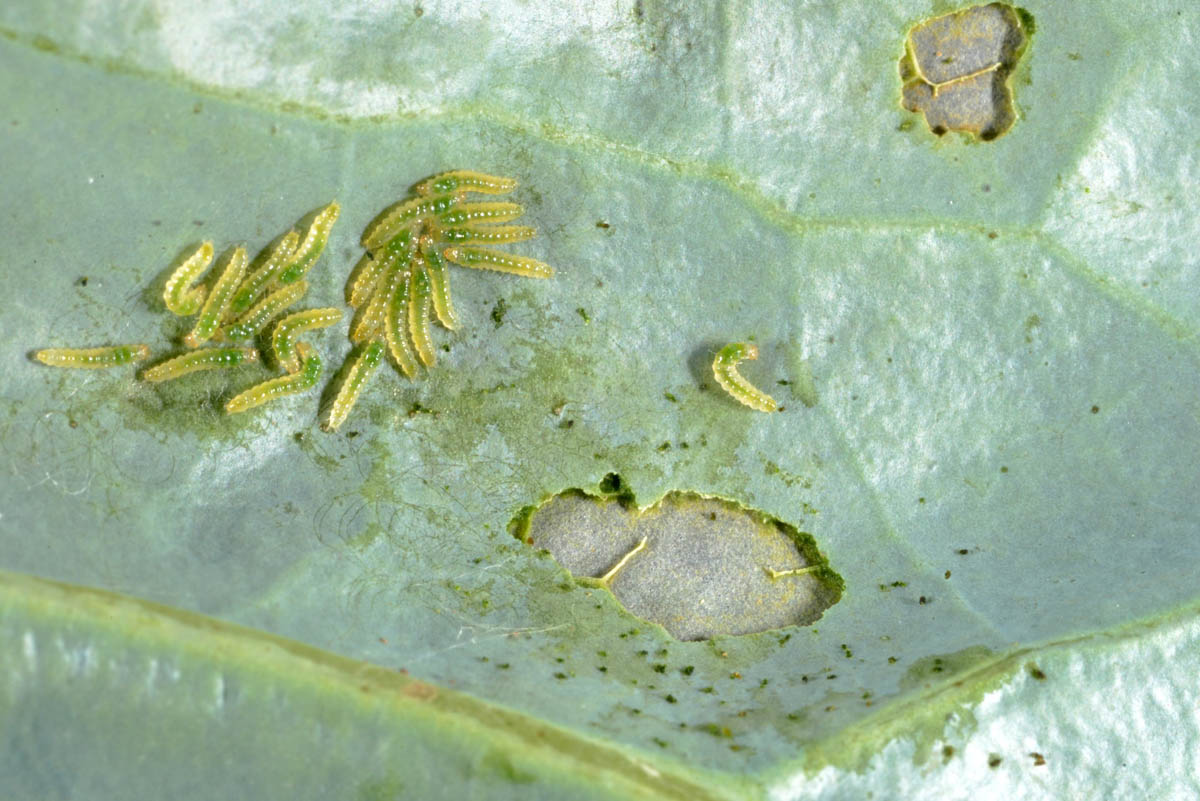 Diamond black moth larva and aphids feeding on cabbage leaf