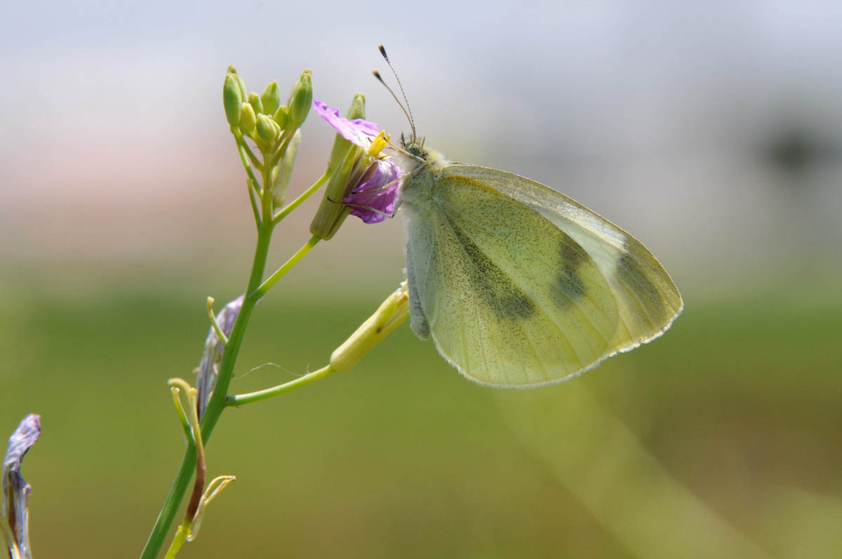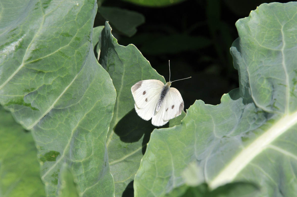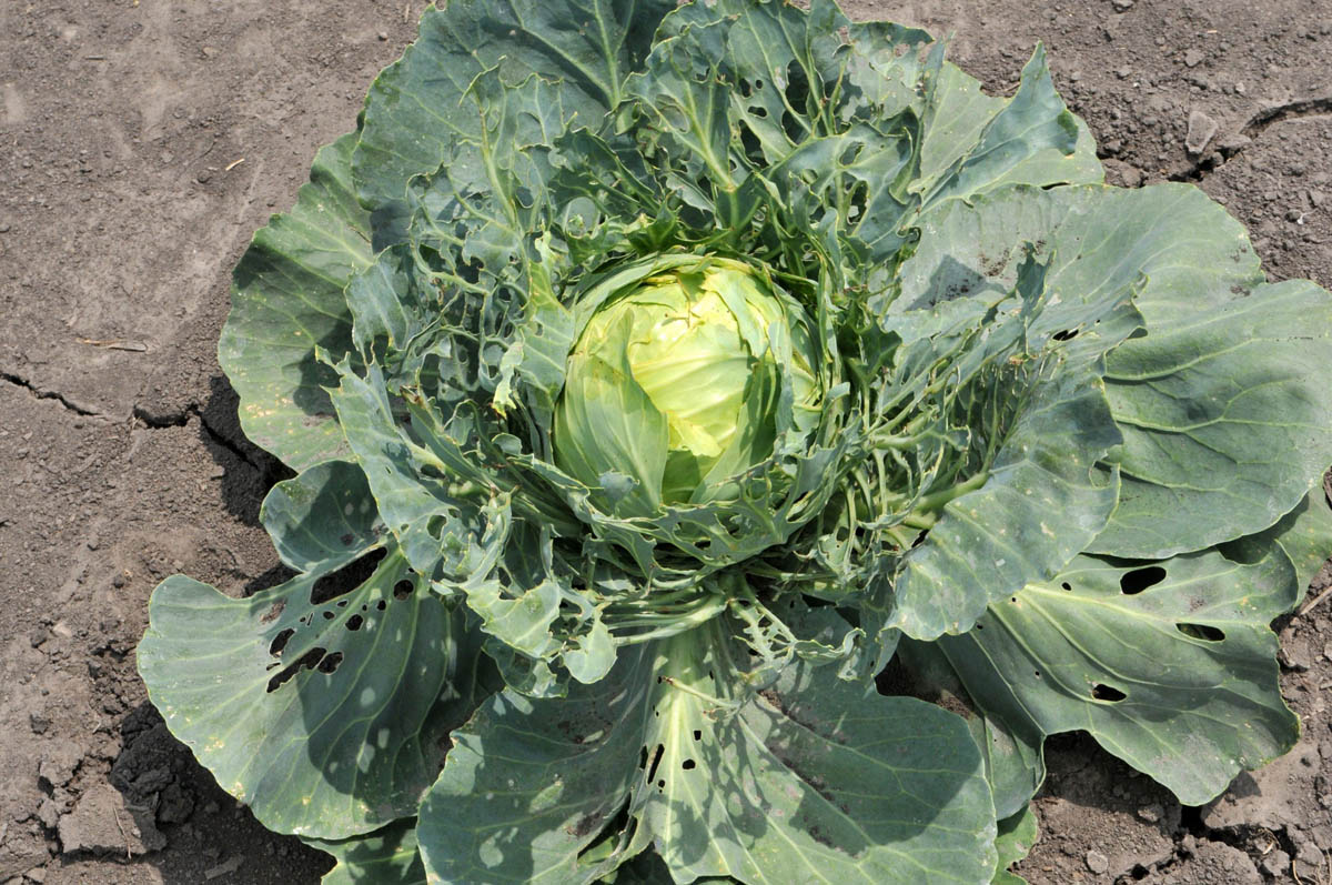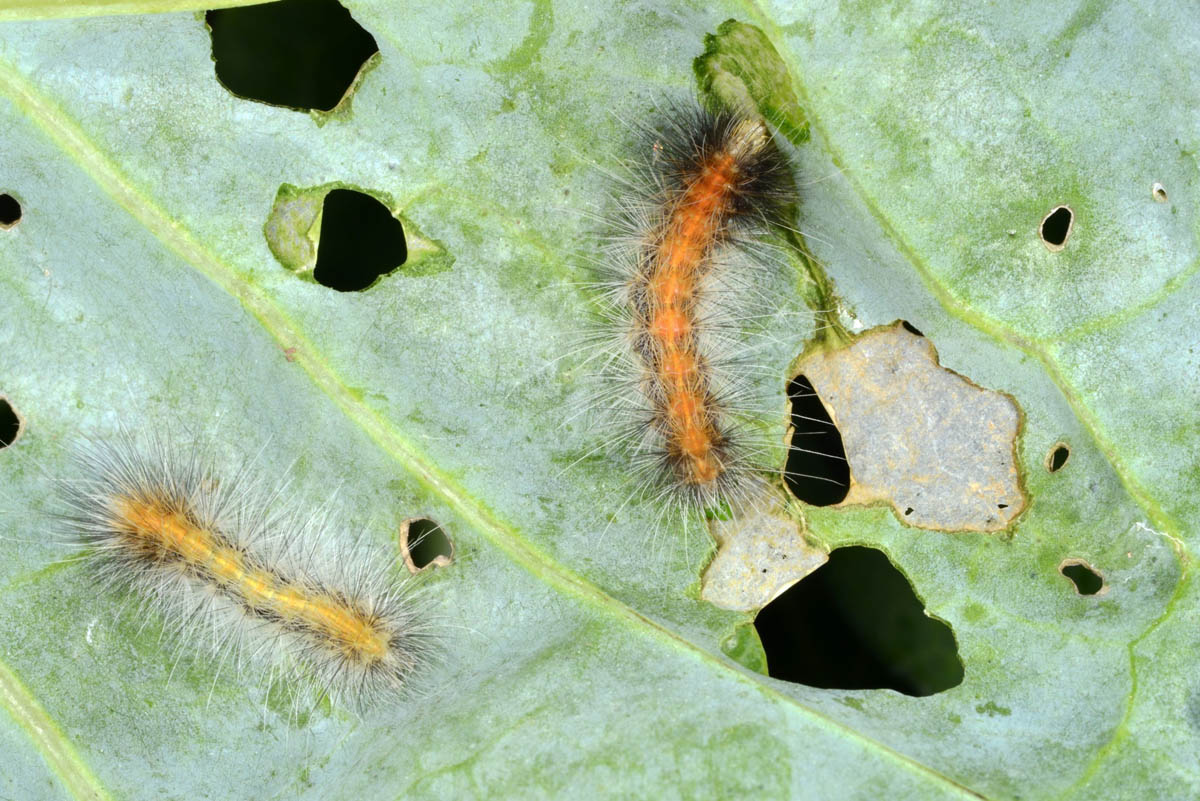 Diamond black moth larva and aphids feeding on cabbage leaf