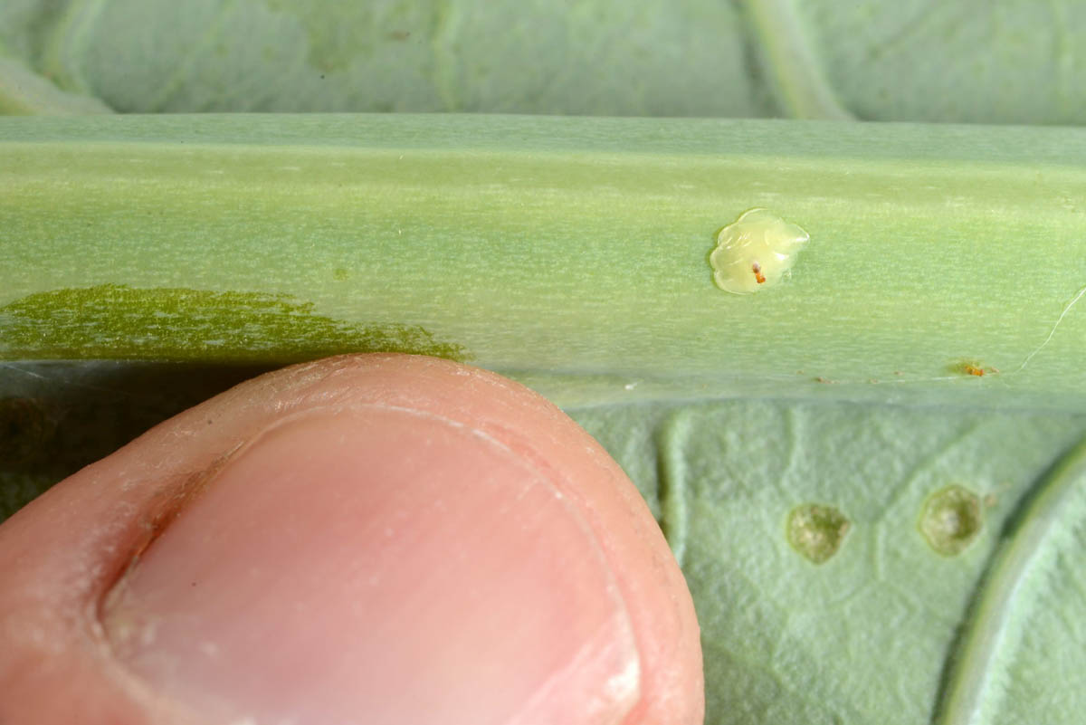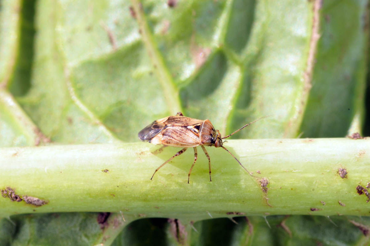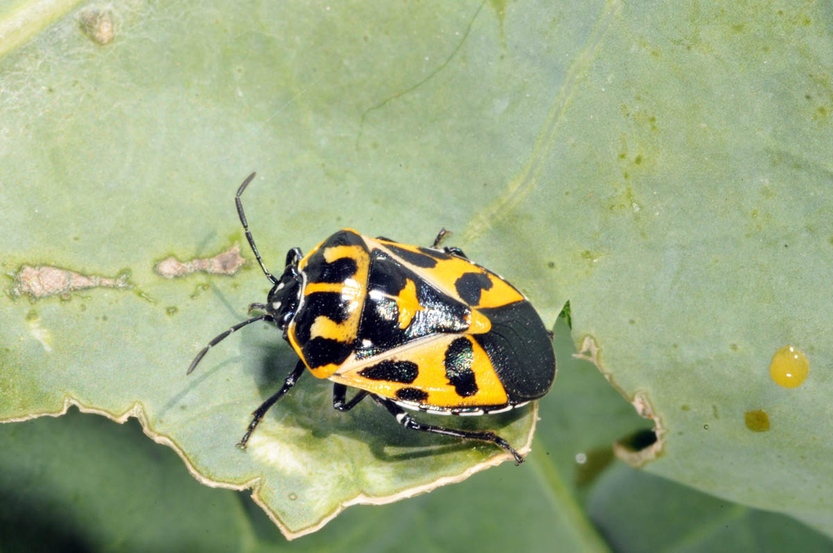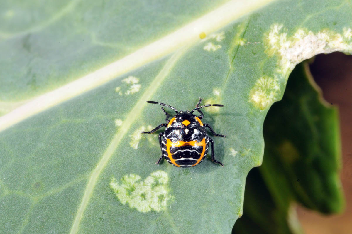 Harlequin bug nymph on crucifer leaf (dorsal view)