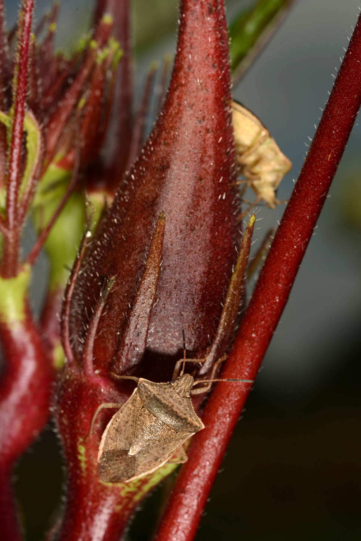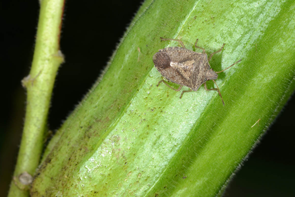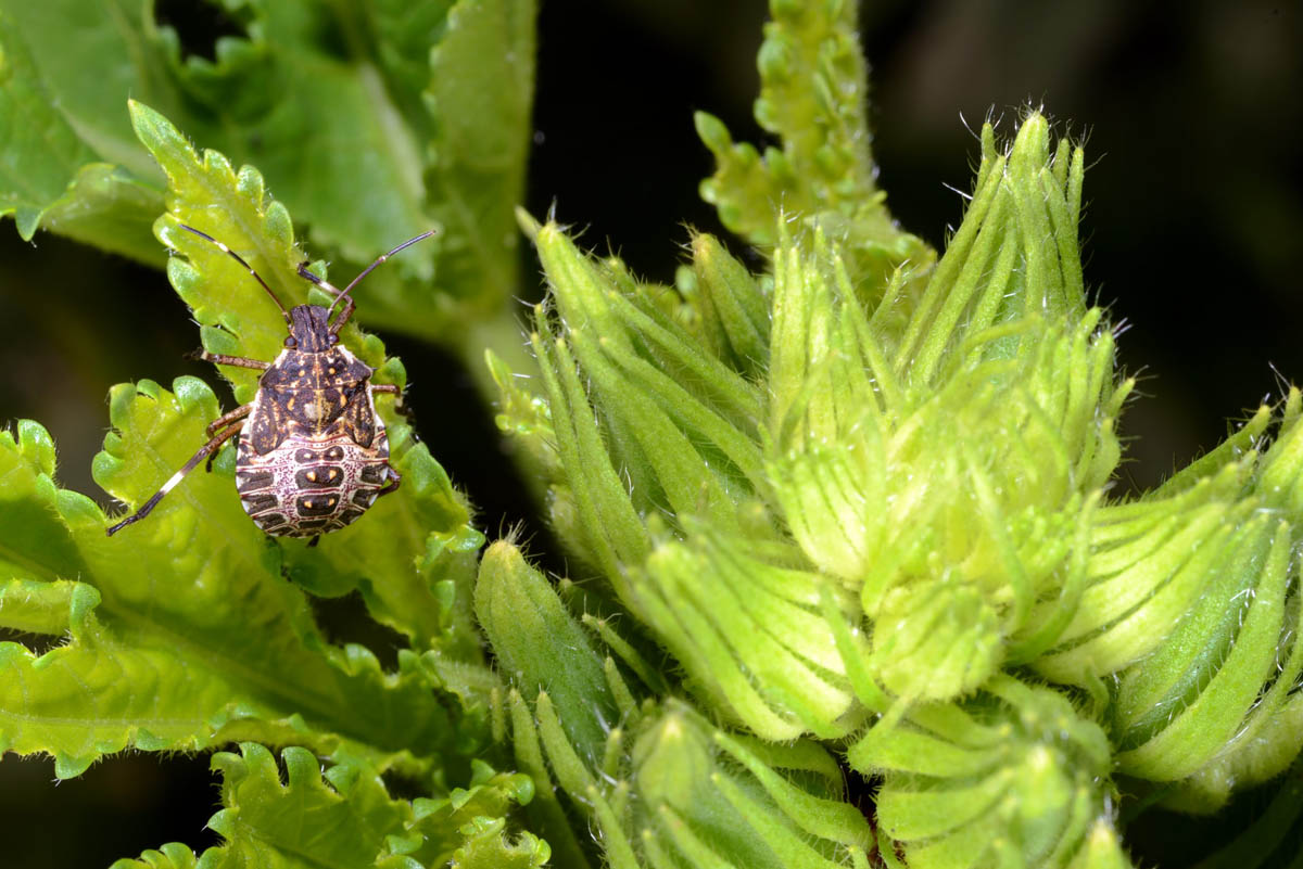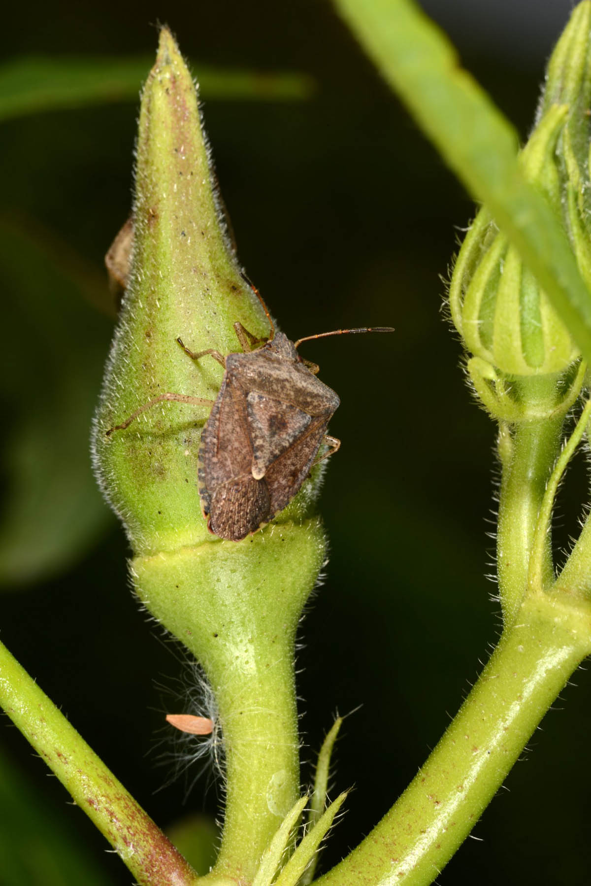 Brown marmorated stink bug nymph on okra terminal (dorsal view)