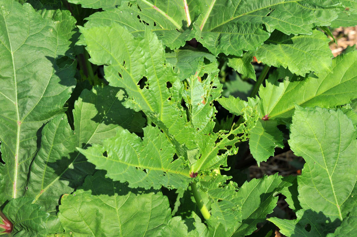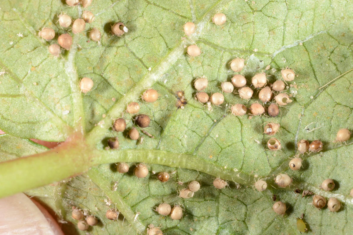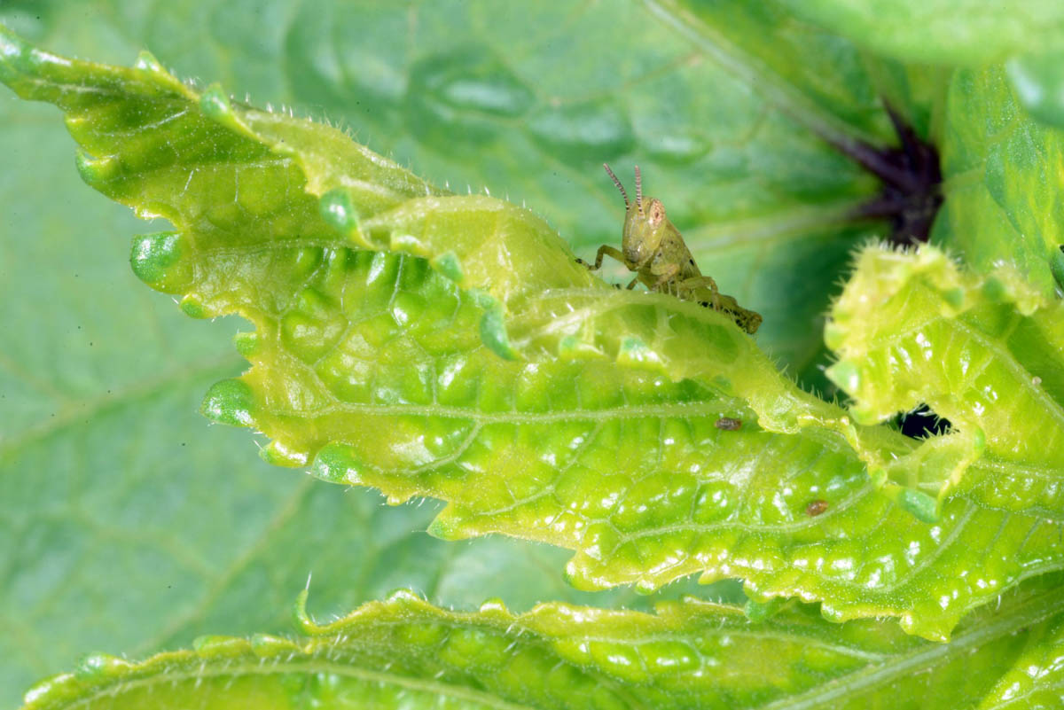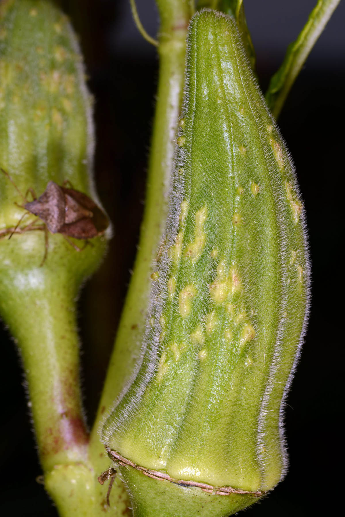 Brown marmorated stink bug nymph on okra terminal (dorsal view)