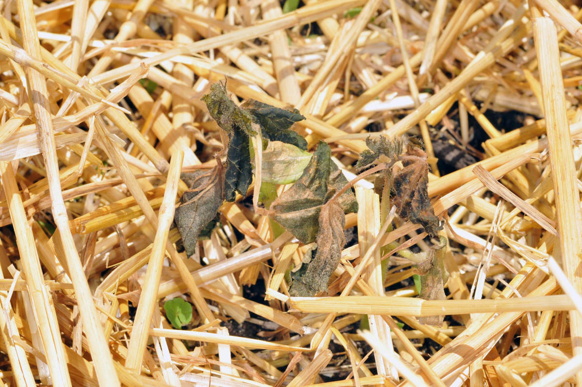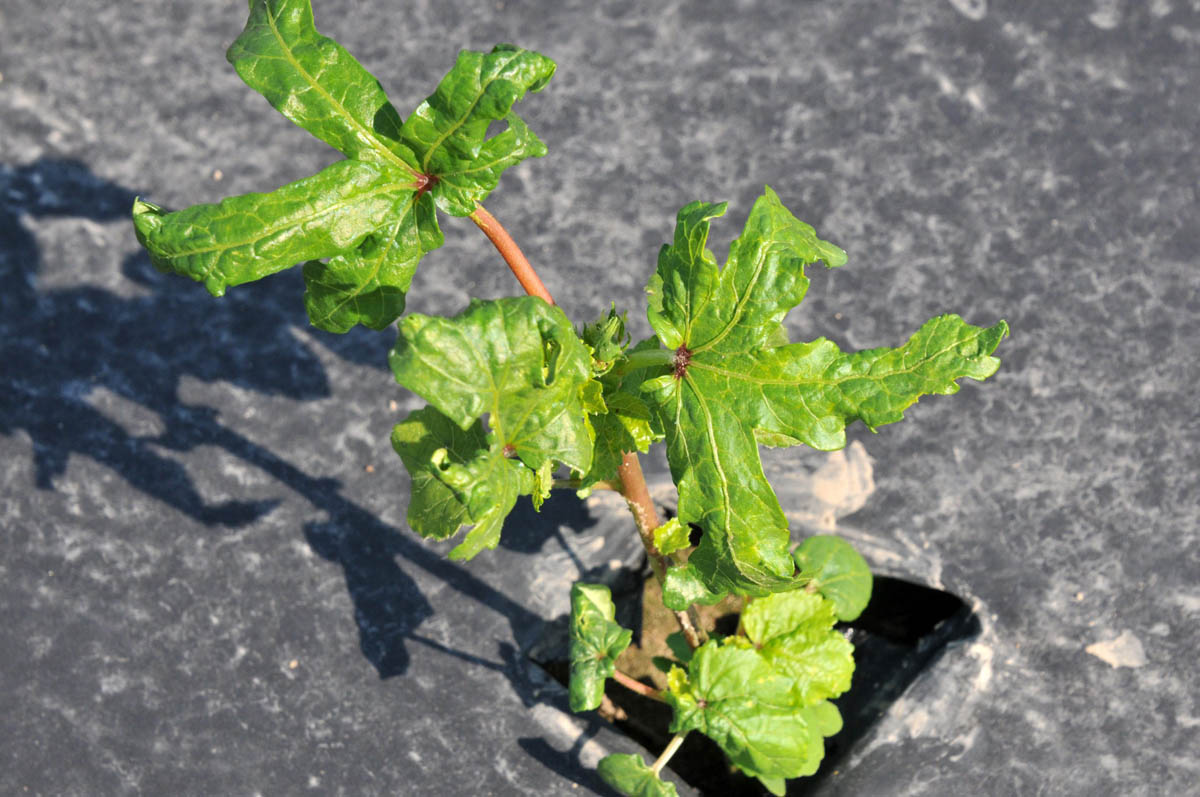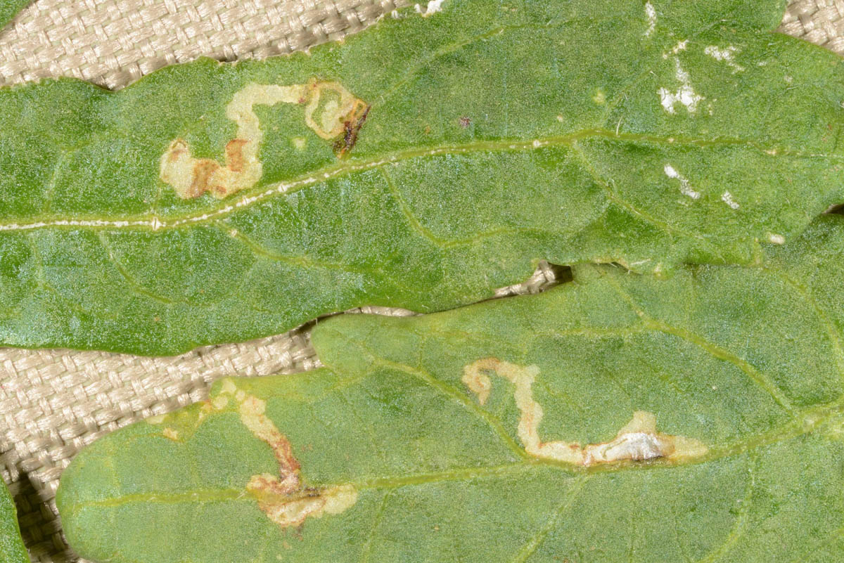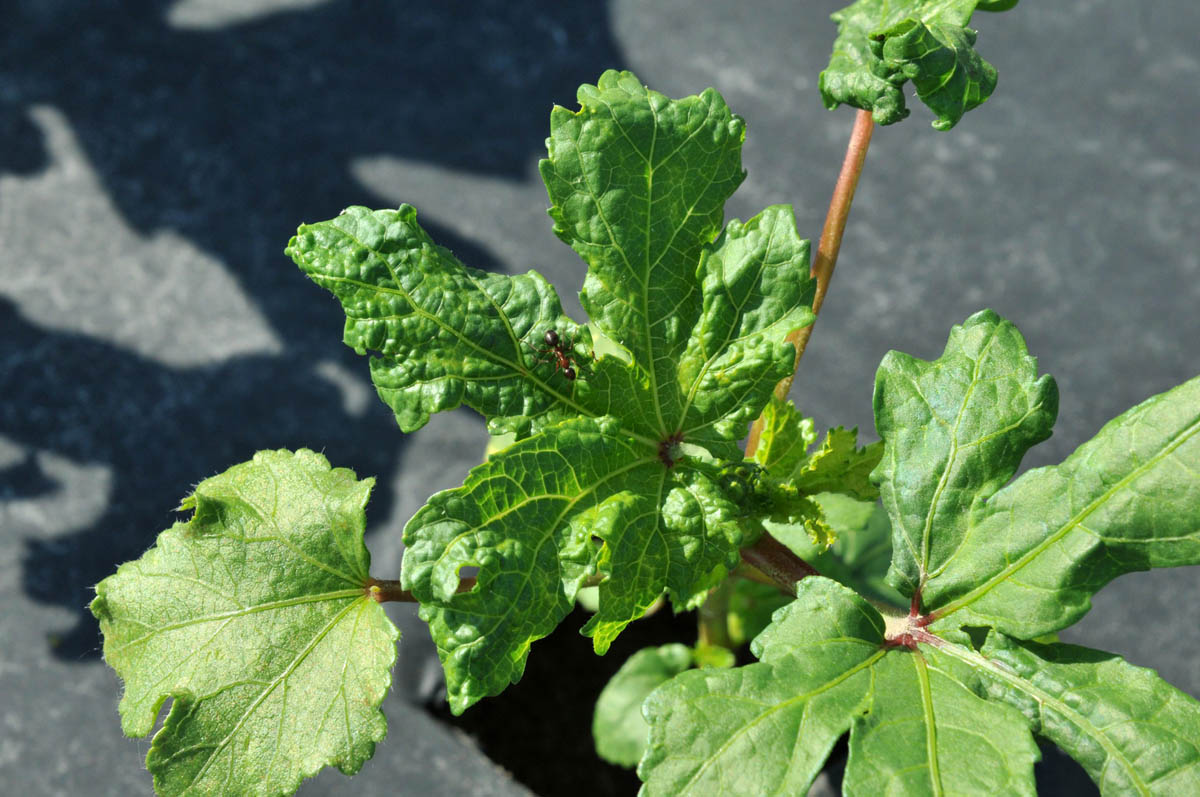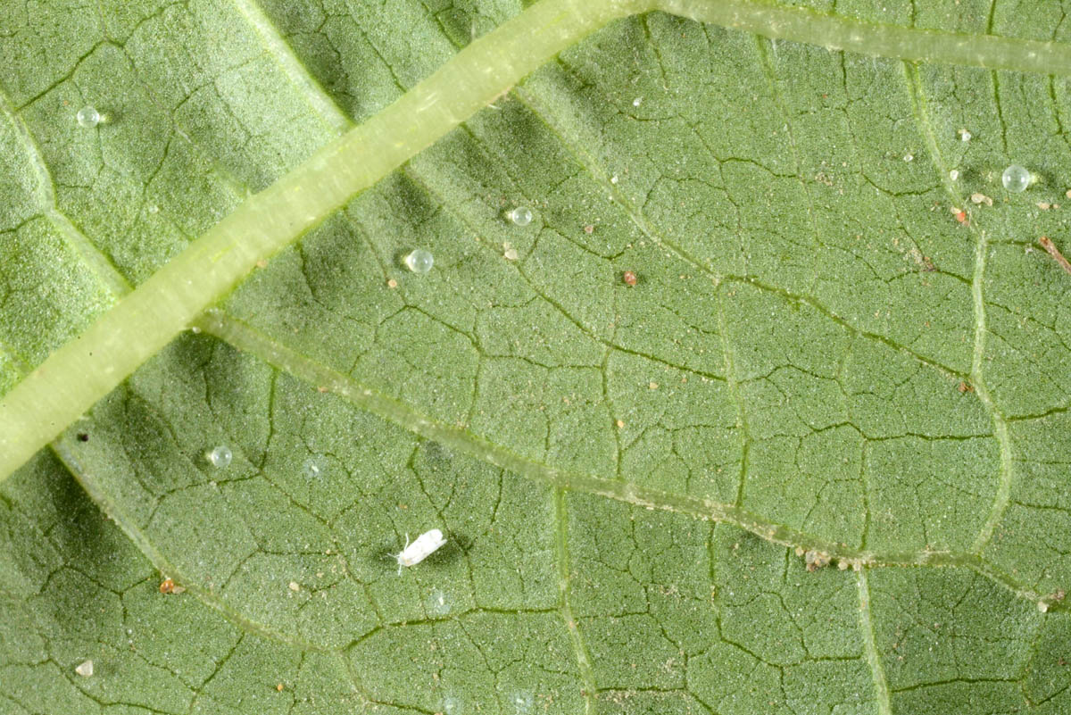 Brown marmorated stink bug nymph on okra terminal (dorsal view)