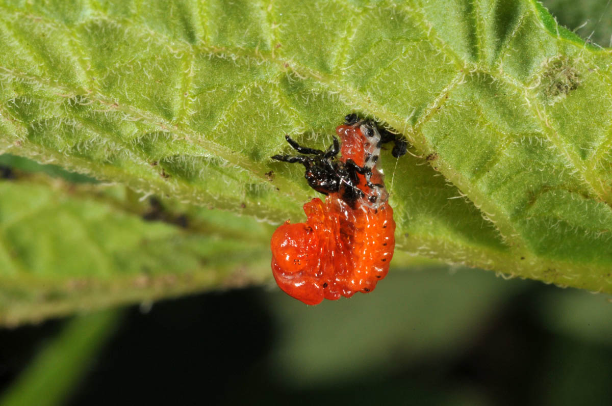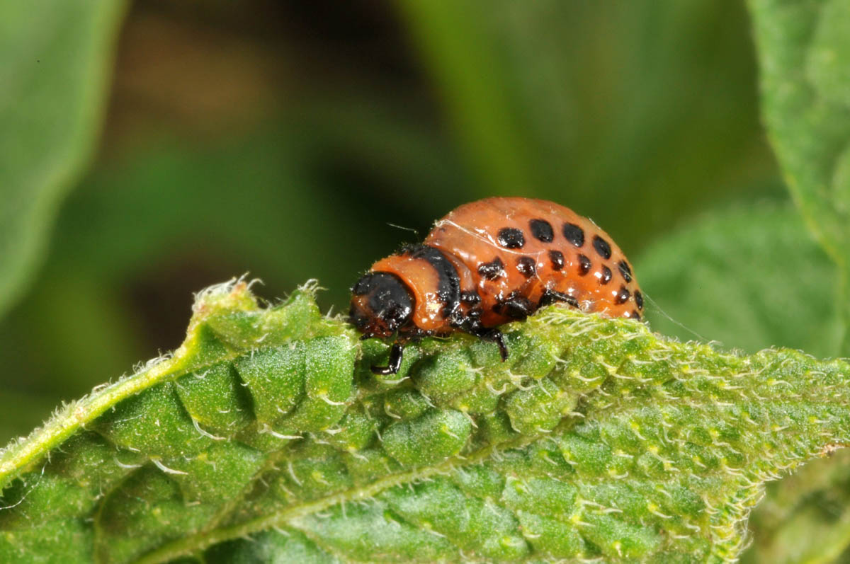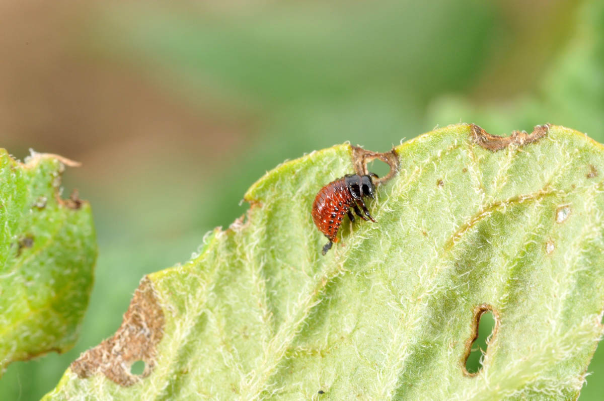 Early instar Colorado potato beetle larva feeding on leaf