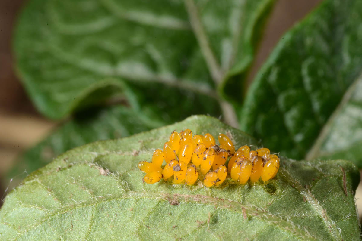 Colorado potato beetle eggs on leaf