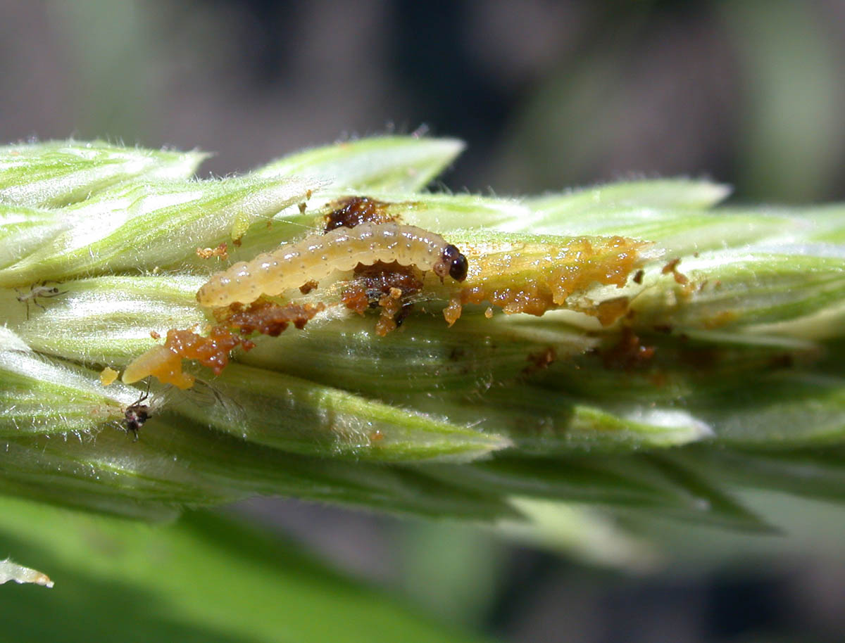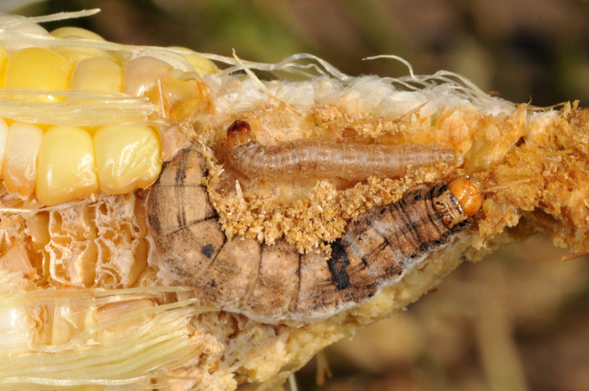 Large infected corn earworm and small European corn borer larva in corn tip
