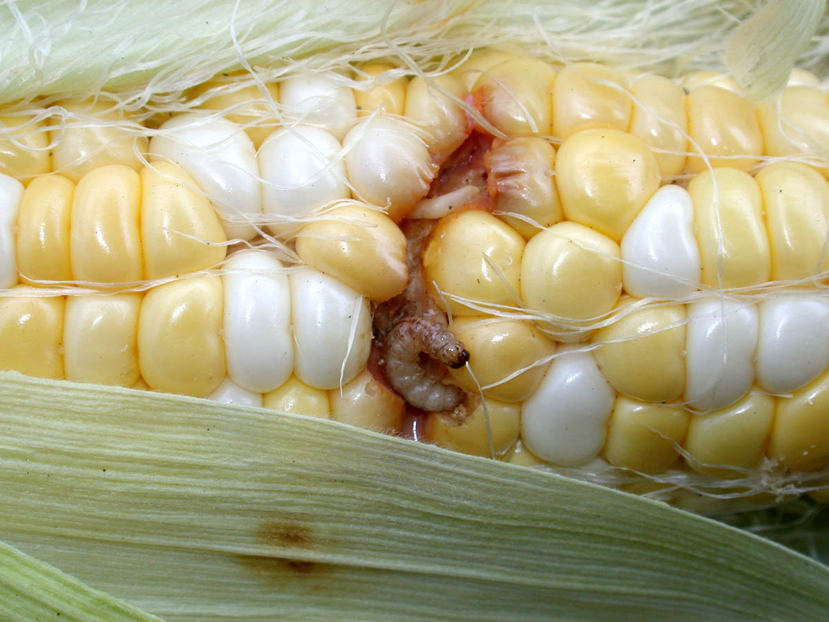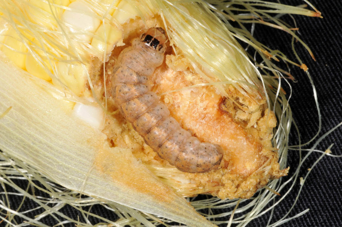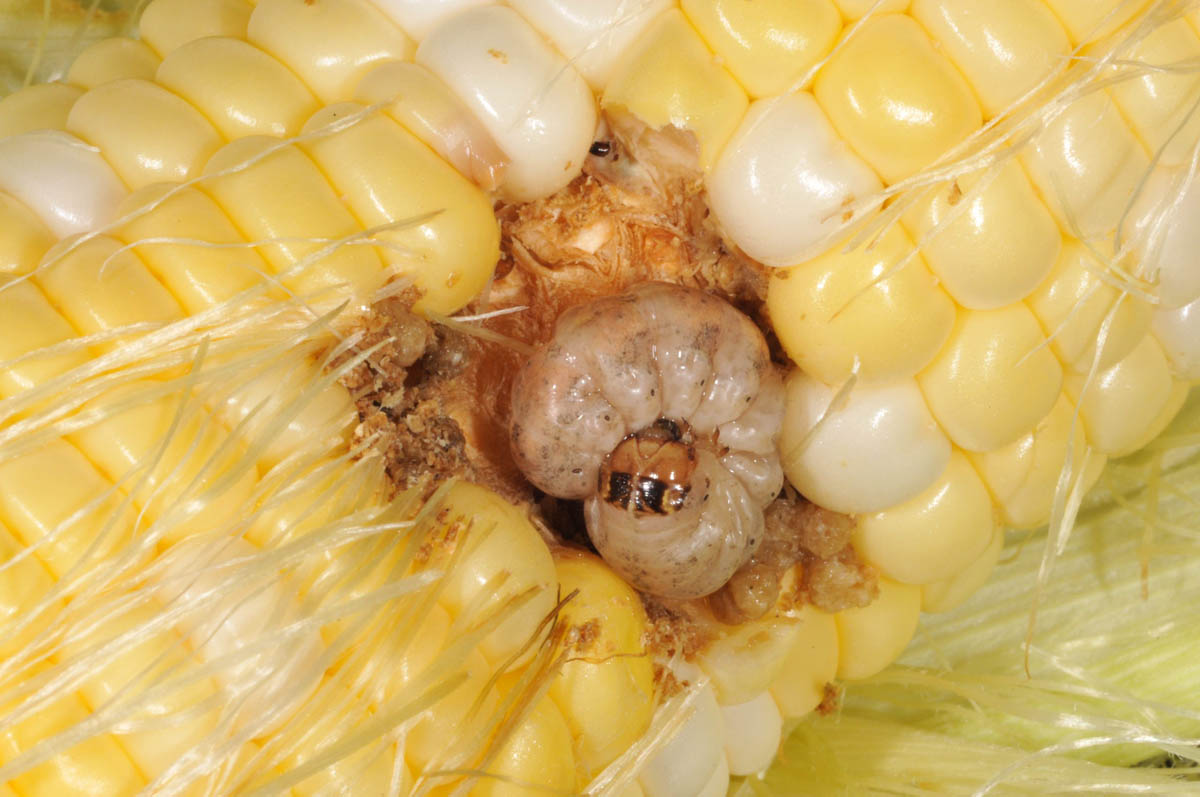 Western bean cutworm larva damage on sweet corn ear
