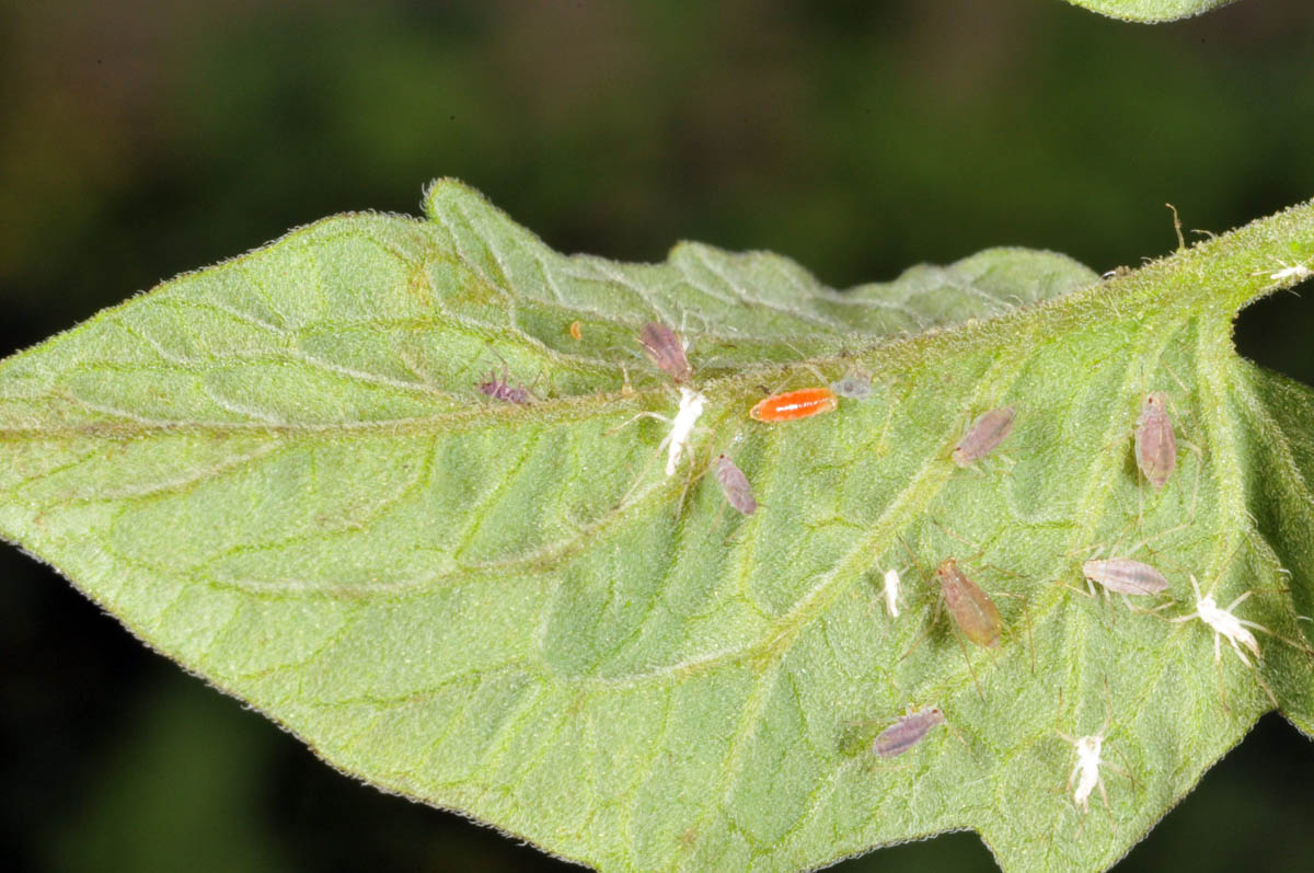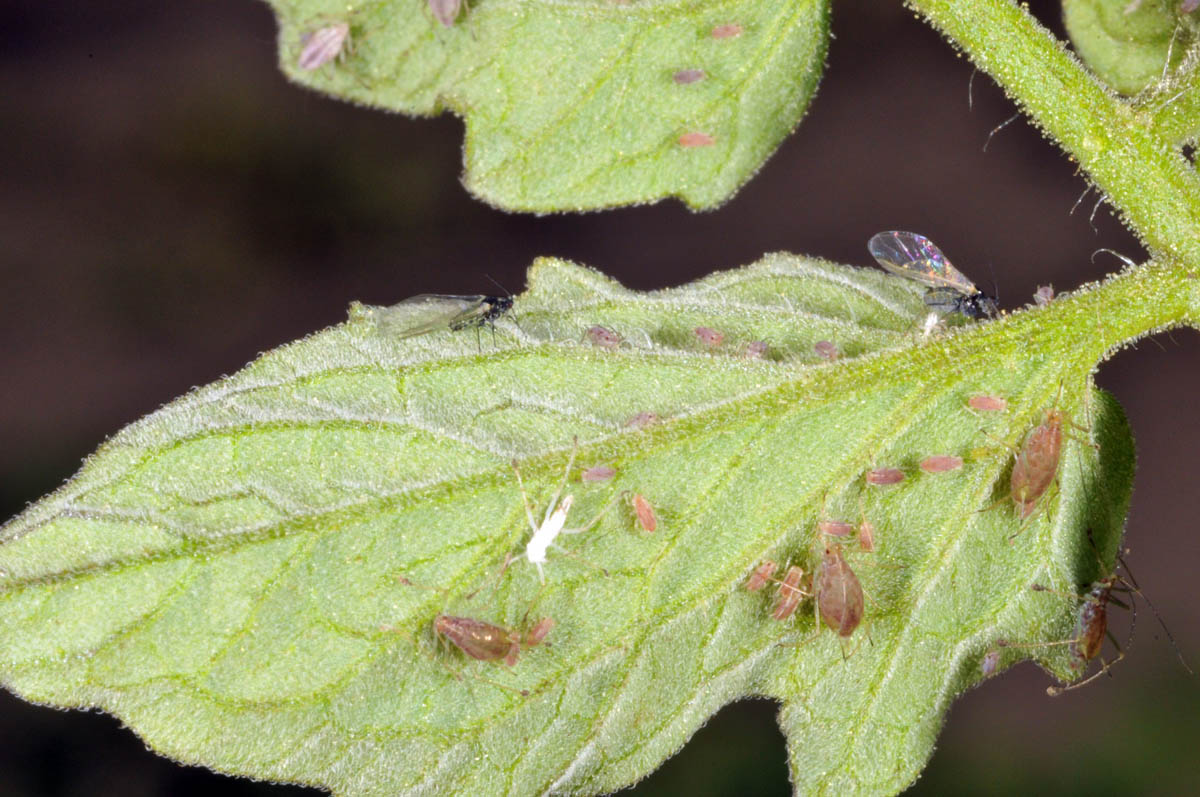 Aphids and alate nymphs on tomato leaf