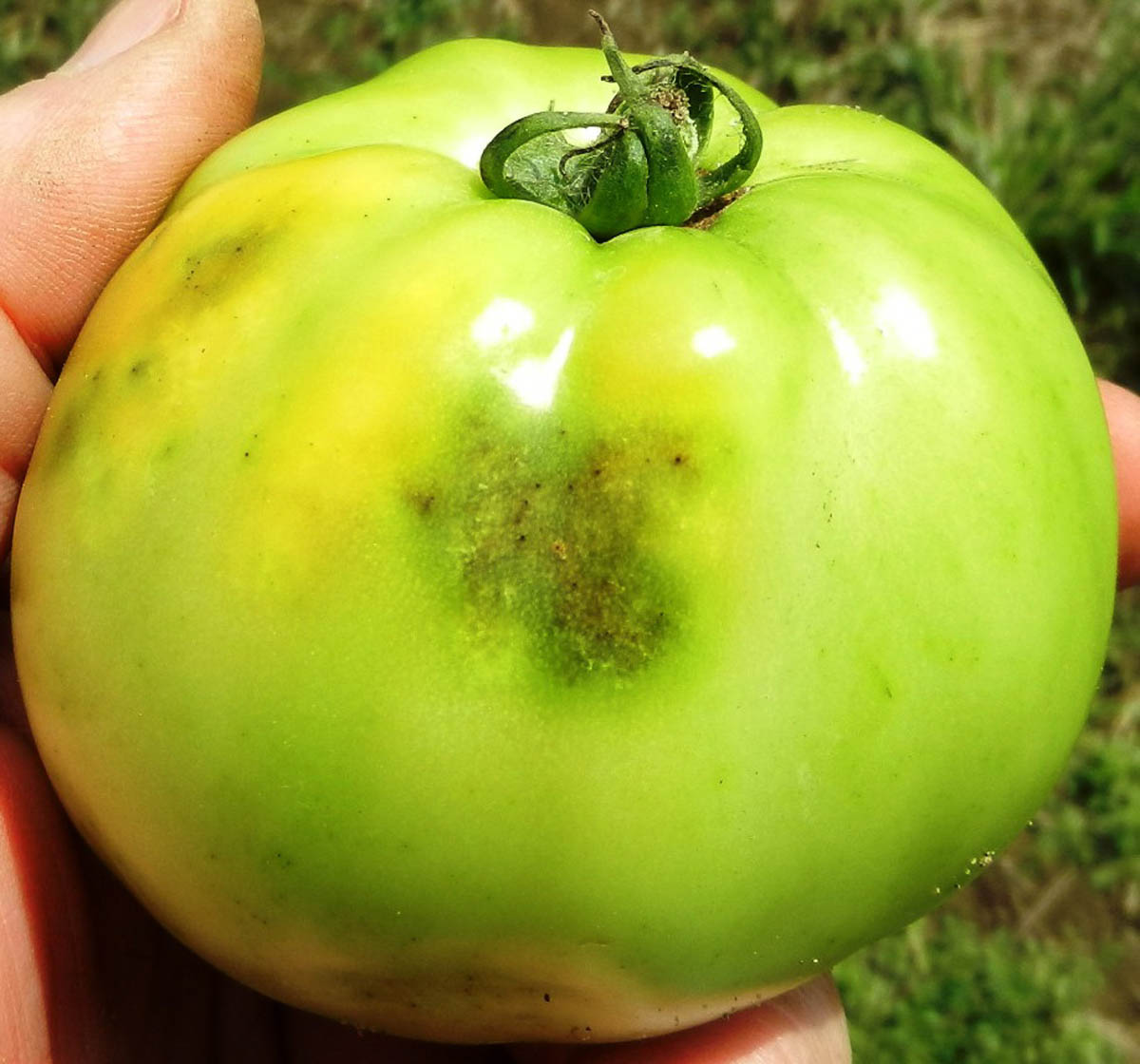 Brown marmorated stink bug damage on a tomato with fungus [Photo by J. Brust]