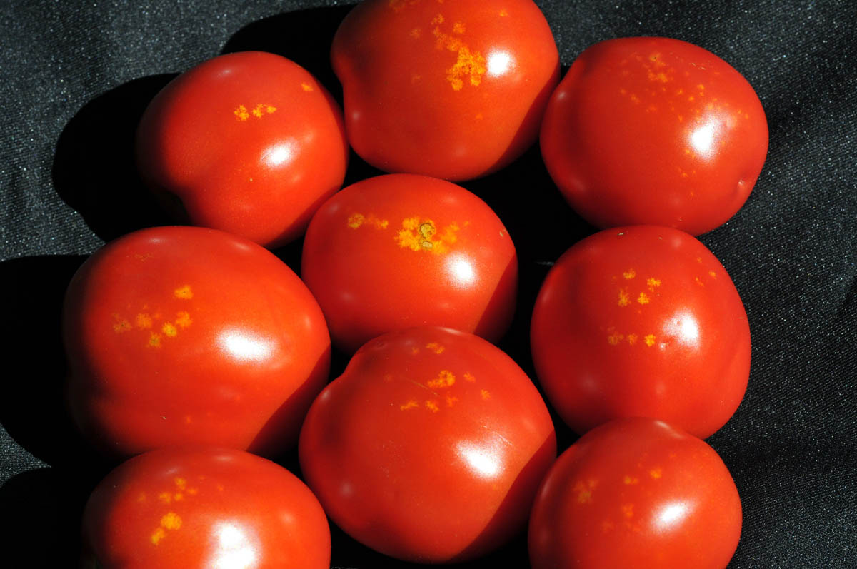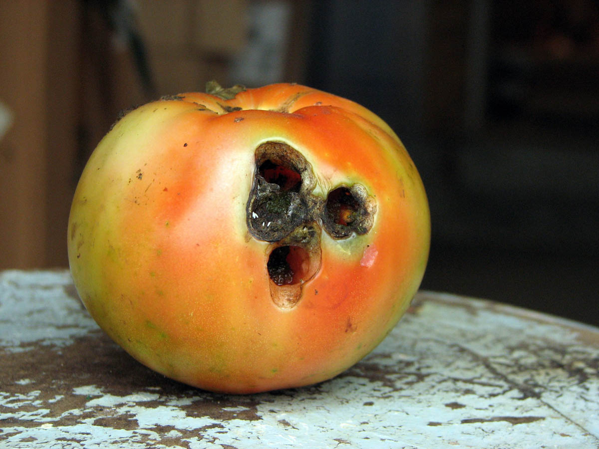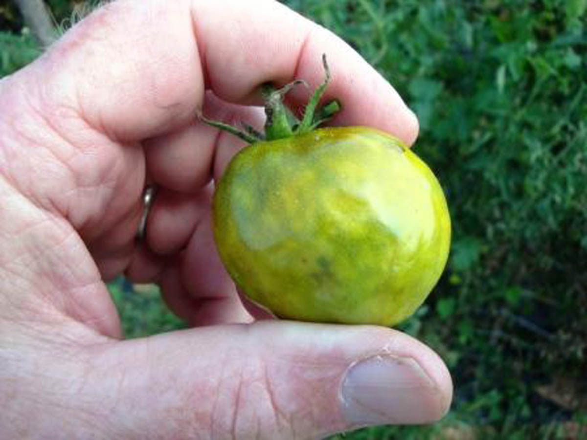 Tomato heavily fed on by brown marmorated stink bug [Photo by J. Brust]