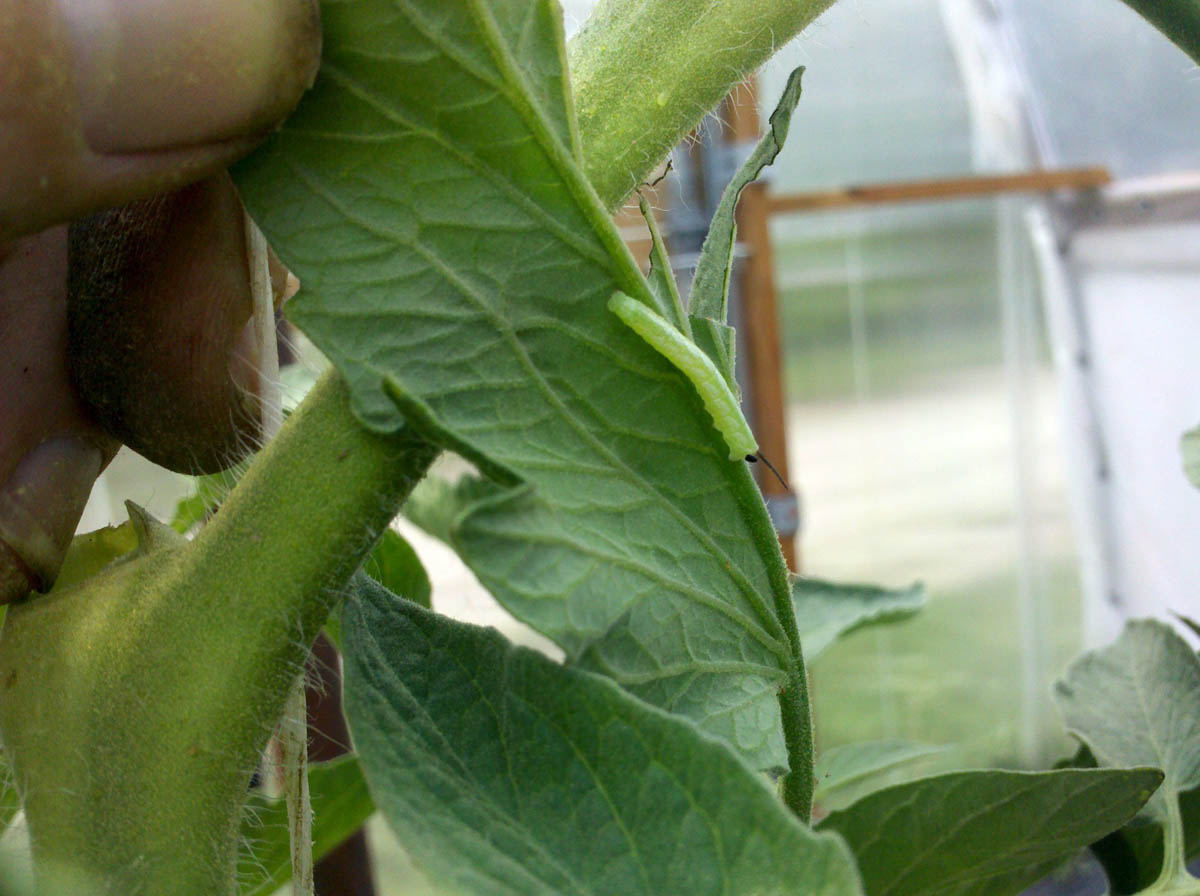 Hornworm extended on tomato stem