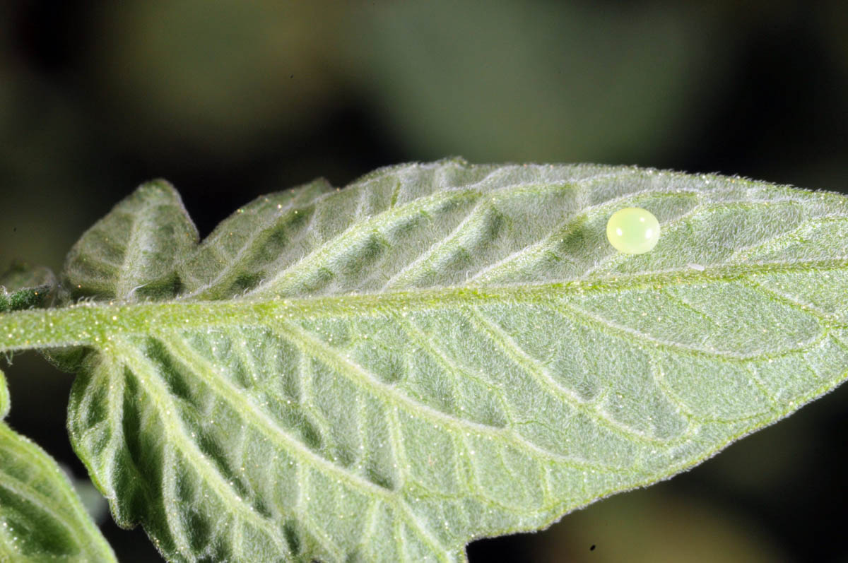 Hornworm egg on tomato leaf