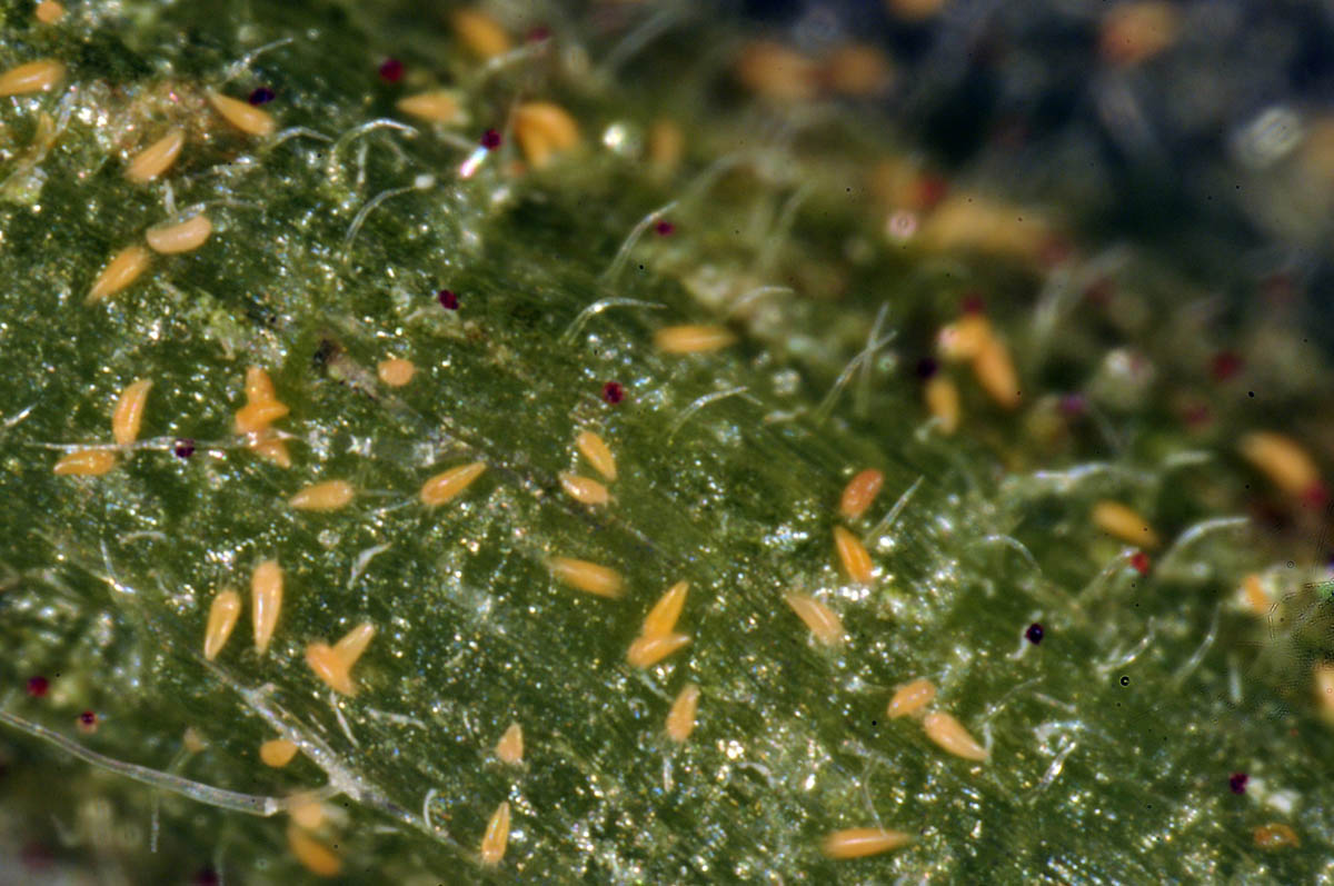 Russet mites on tomato leaf vein (microscopic view)
