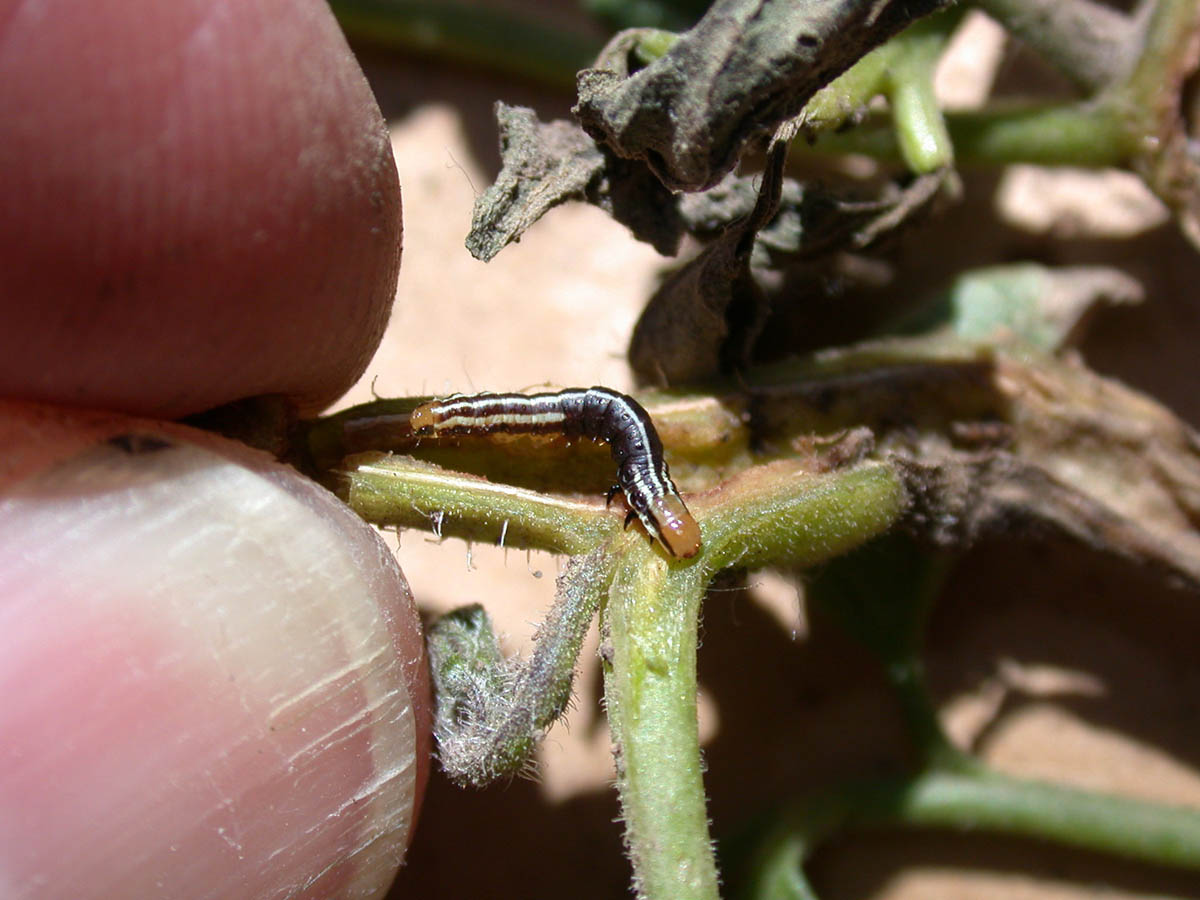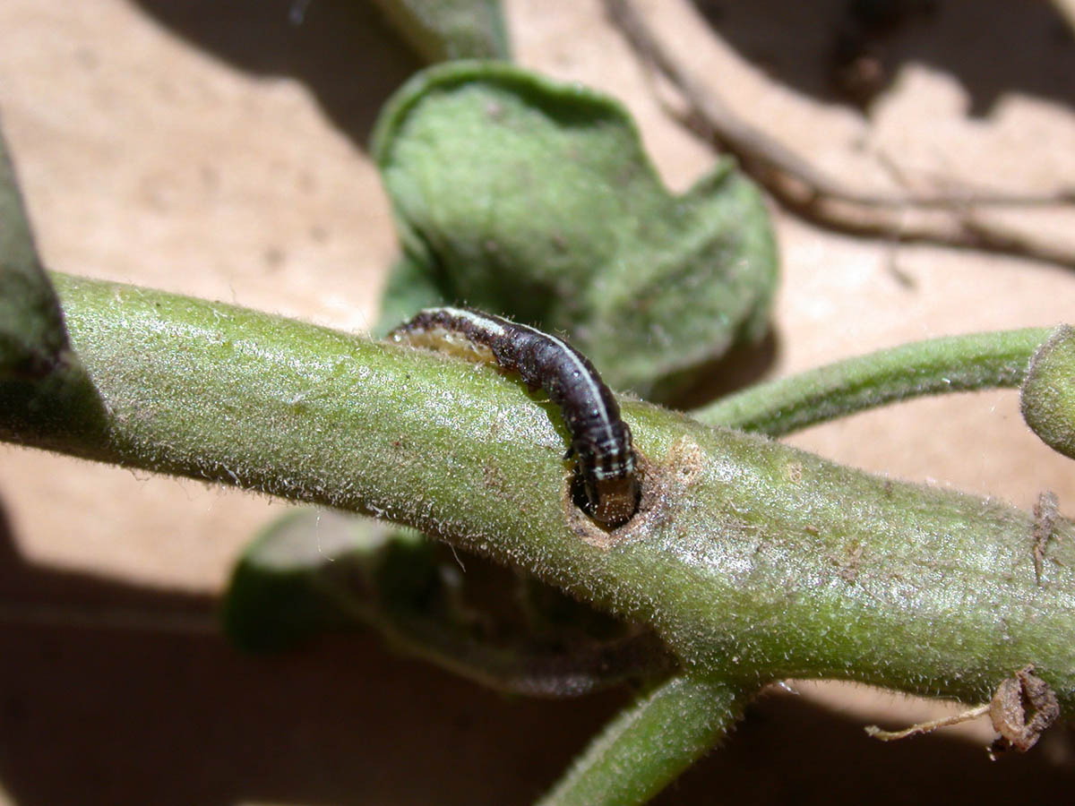 Stalk borer larva on tomato stem