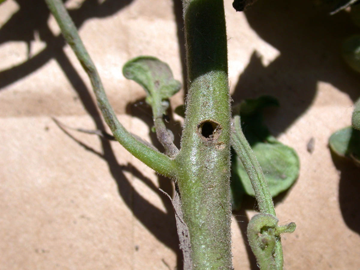 Stalk borer entry hole of tomato plant