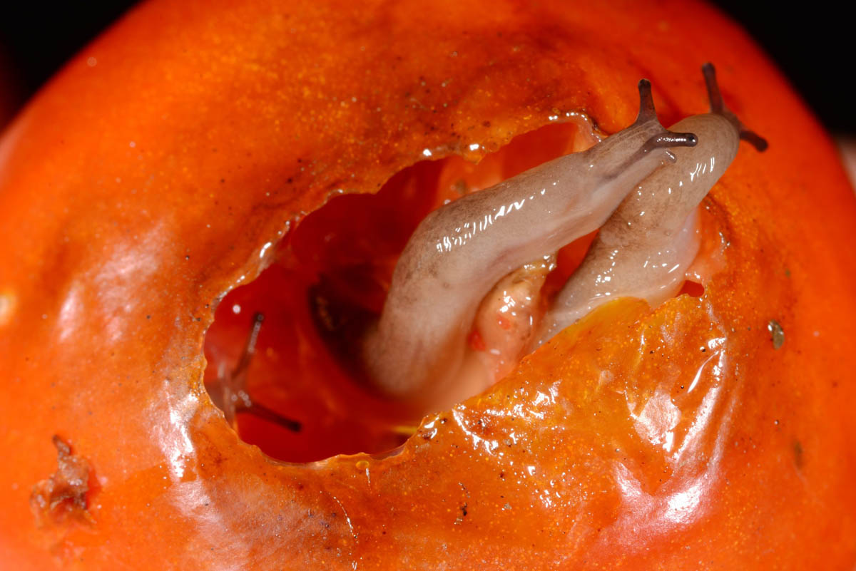 Slug exiting hole in damaged tomato