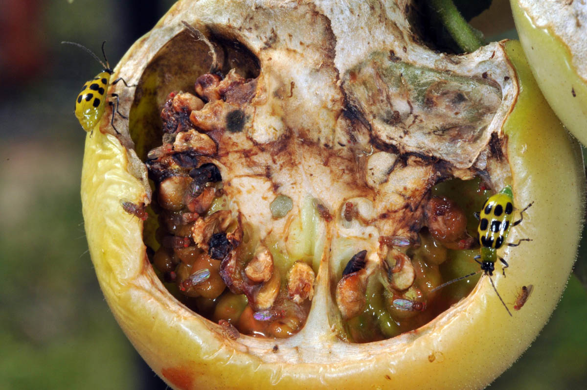 Spotted cucumber beetles on damaged tomatoes