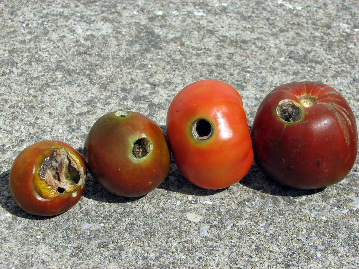 Variegated corn worm damage on tomatoes [Photo by L. Maynard]