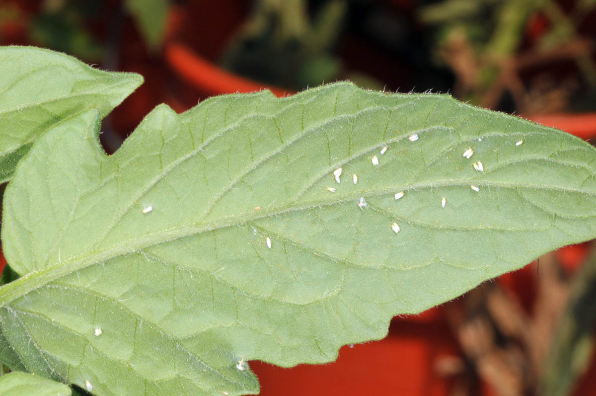 Whiteflies on tomato leaf