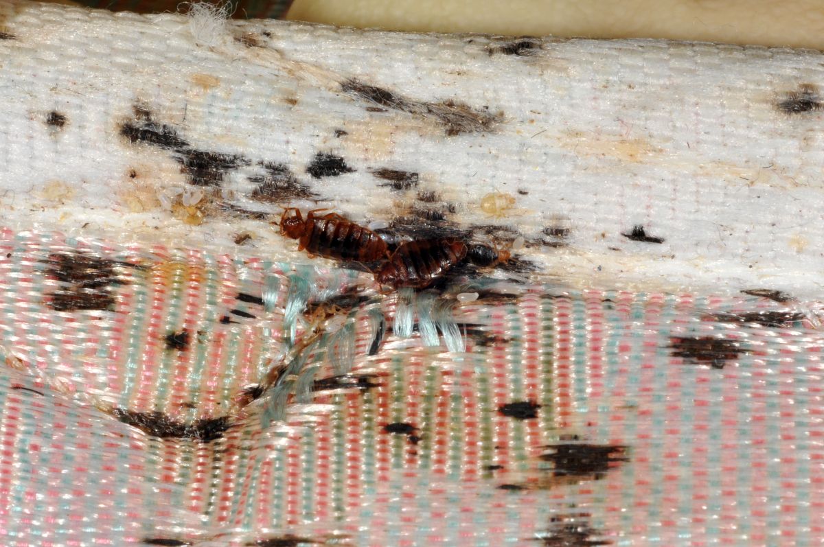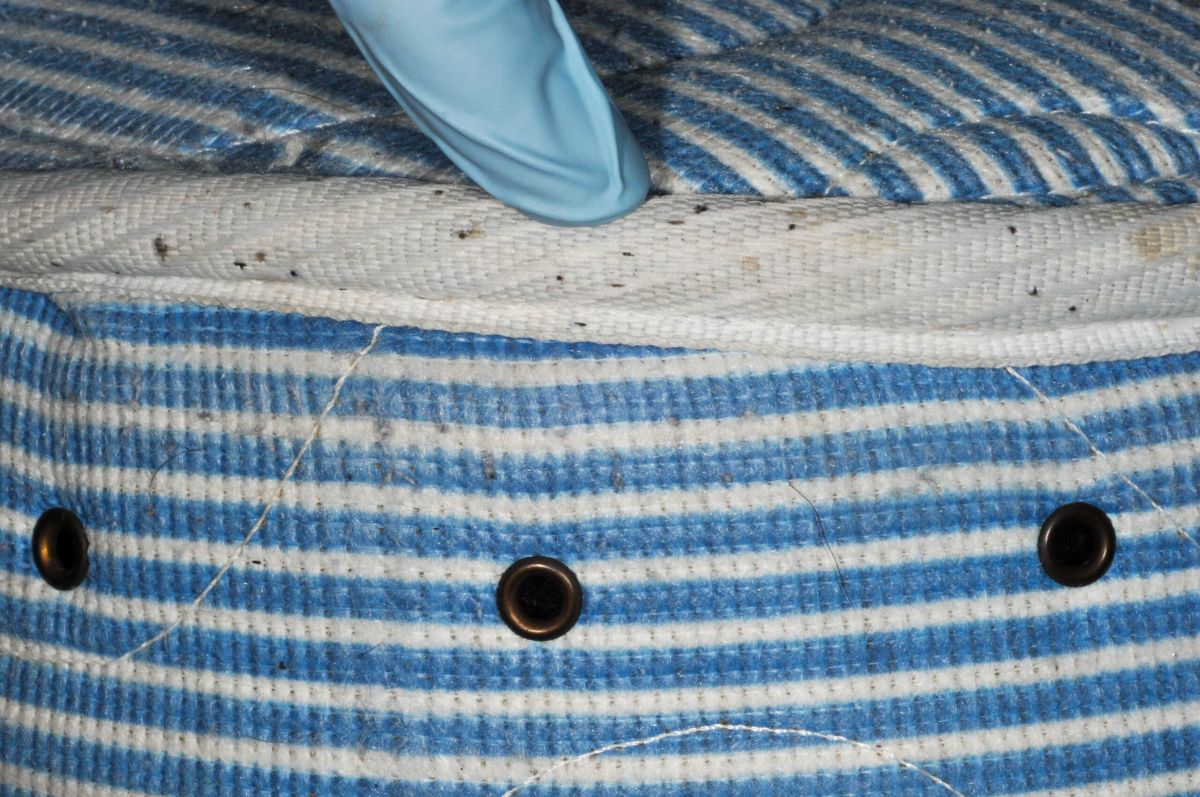 Bed bugs and stains on mattress seam