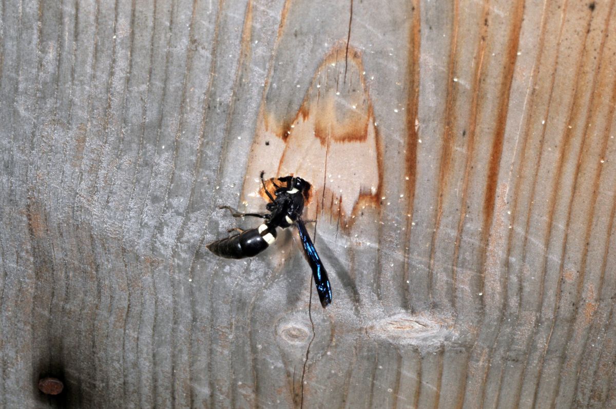 Mason wasp entering hole