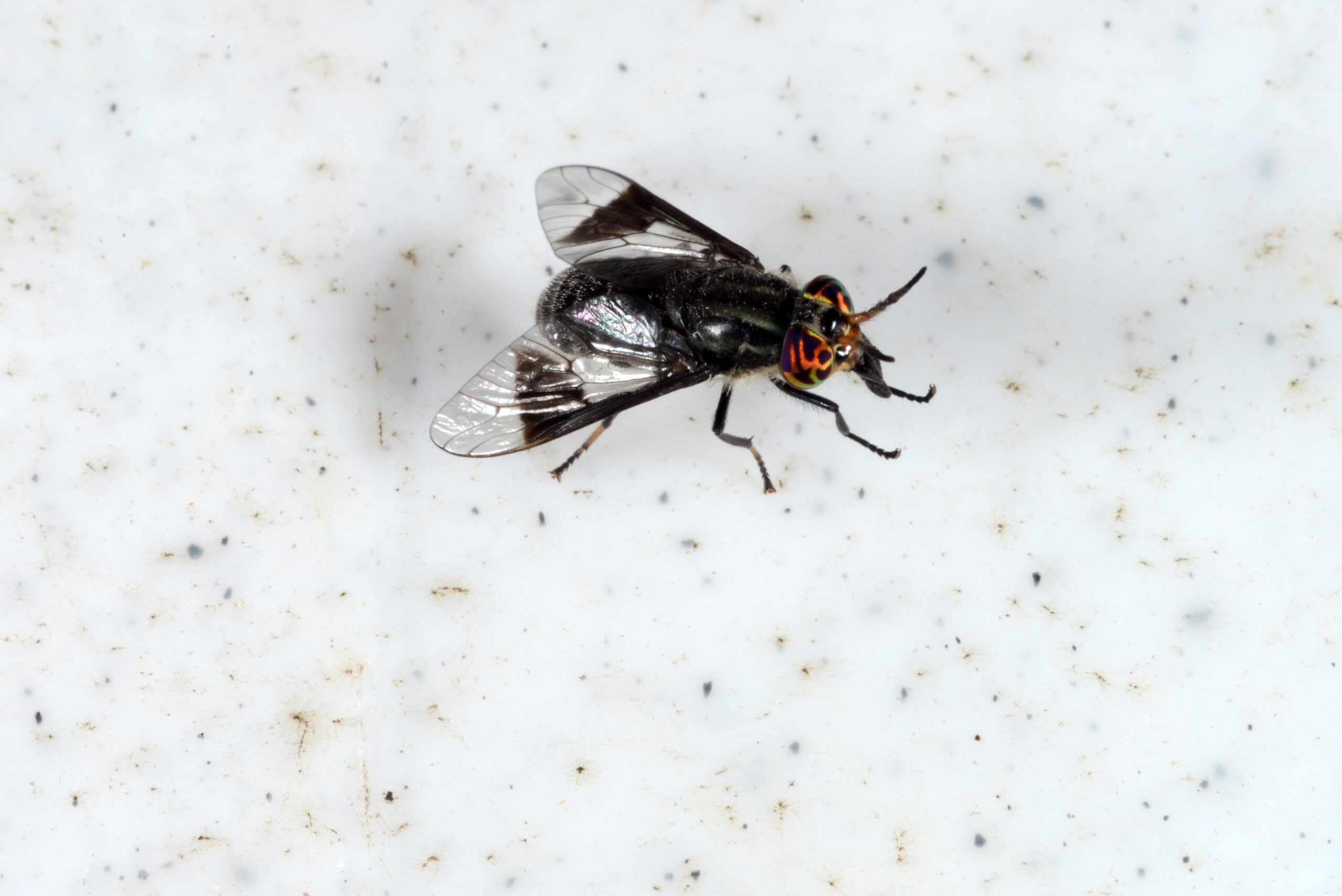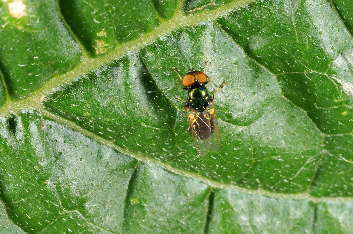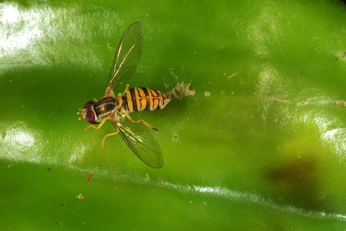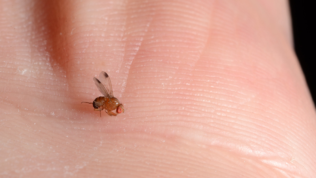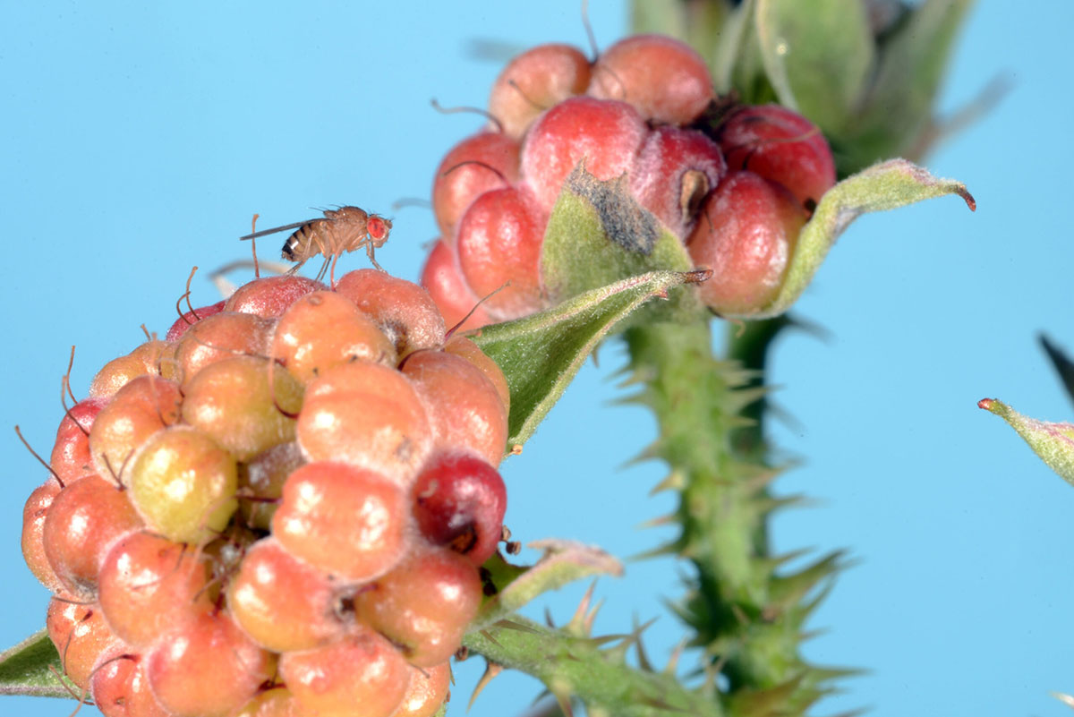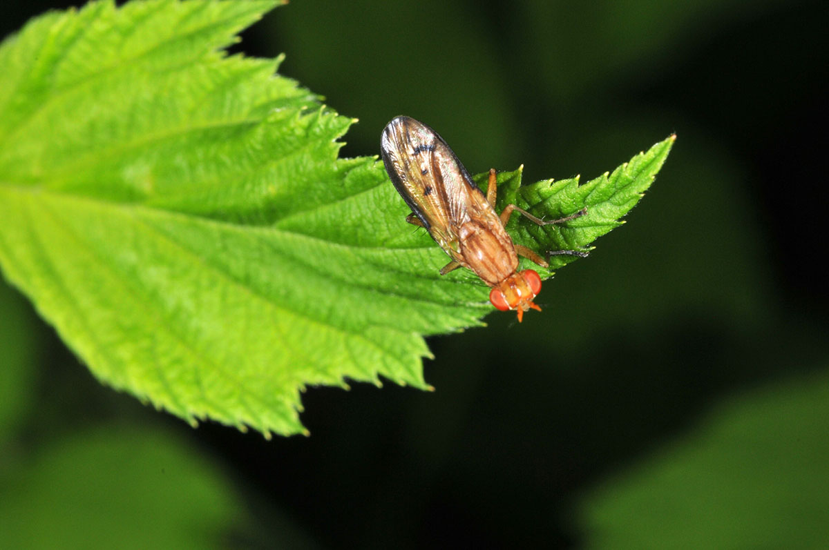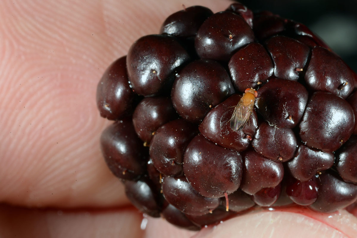 Spotted wing drosophila male fly on blackberry (dorsal view)