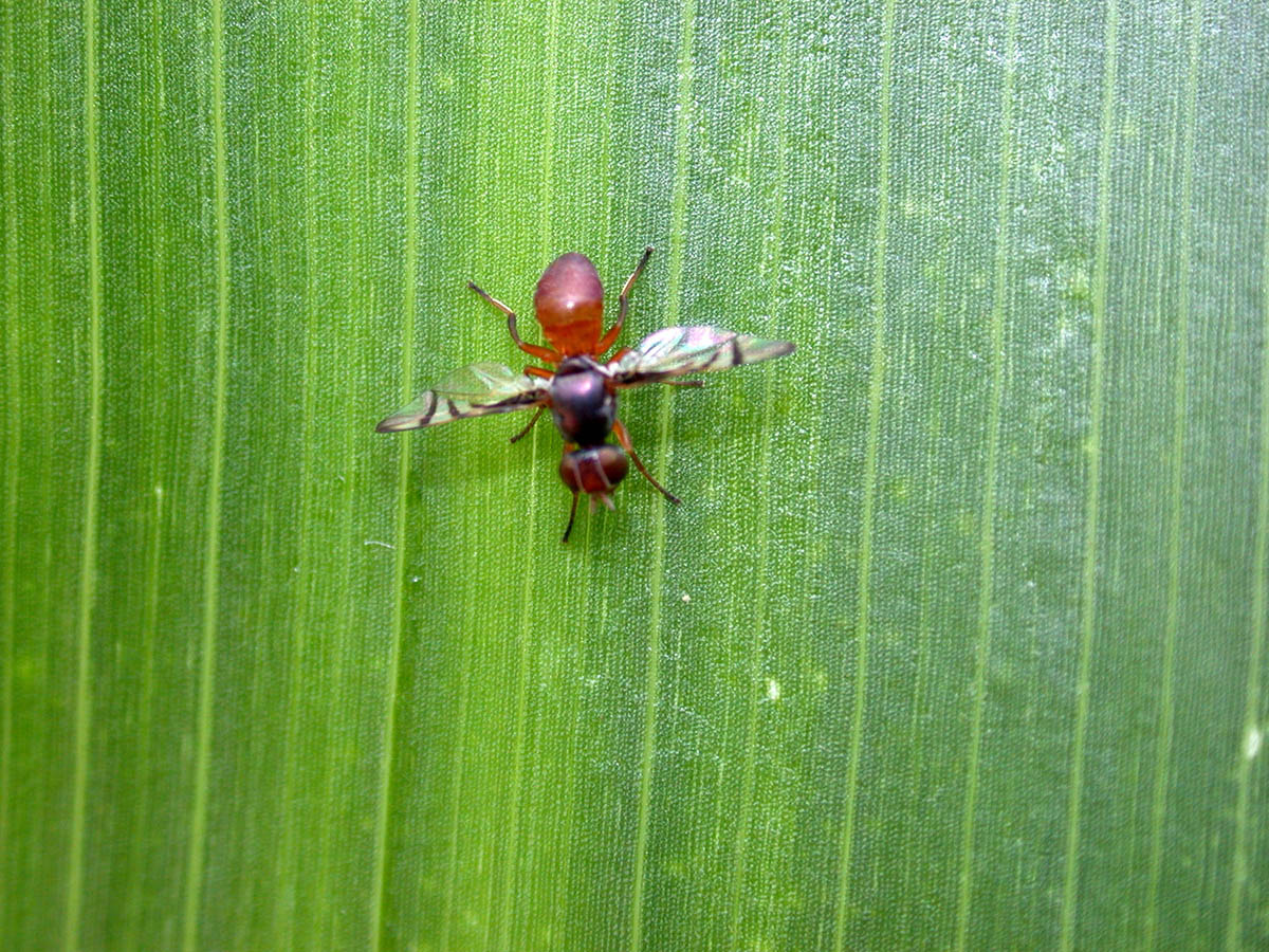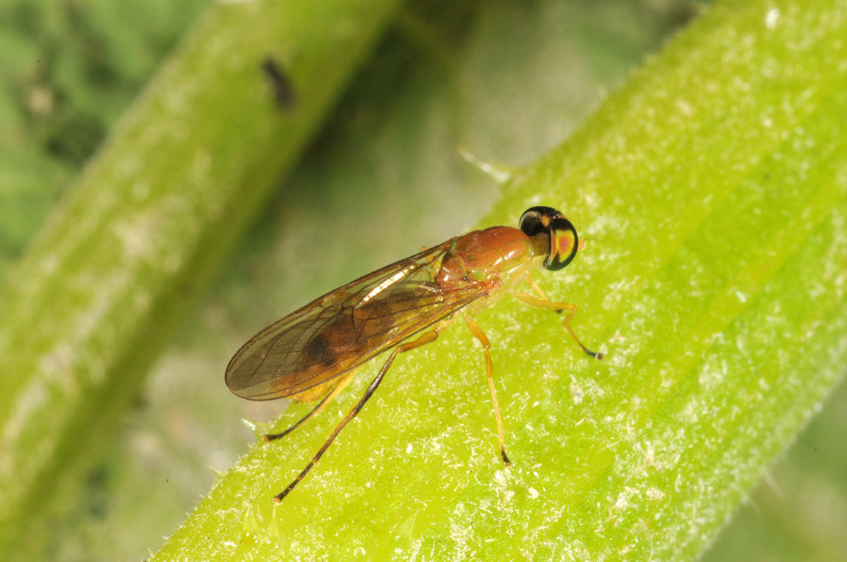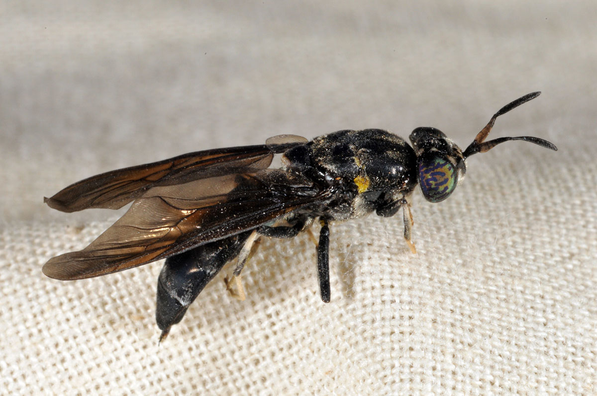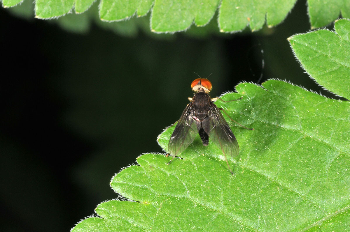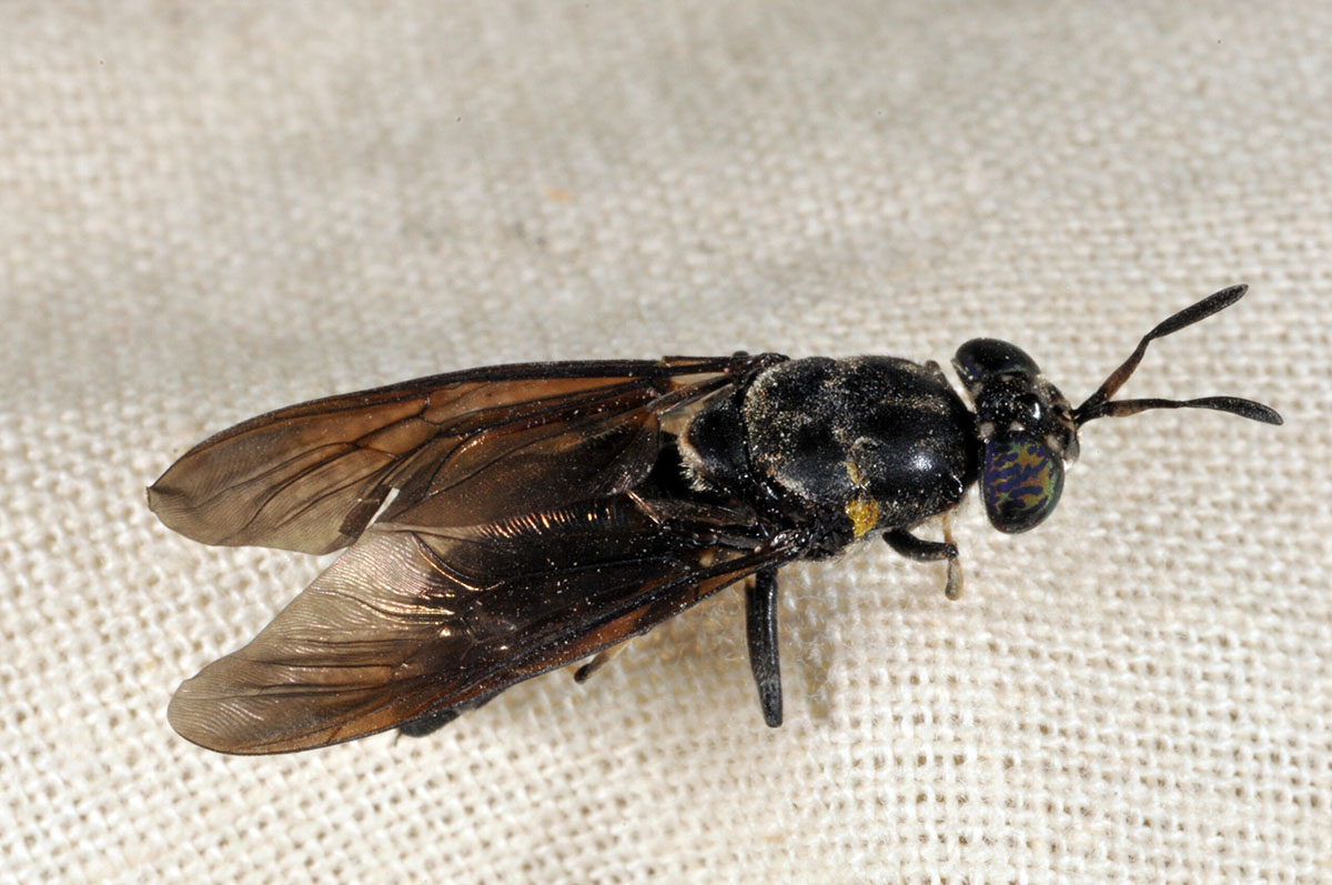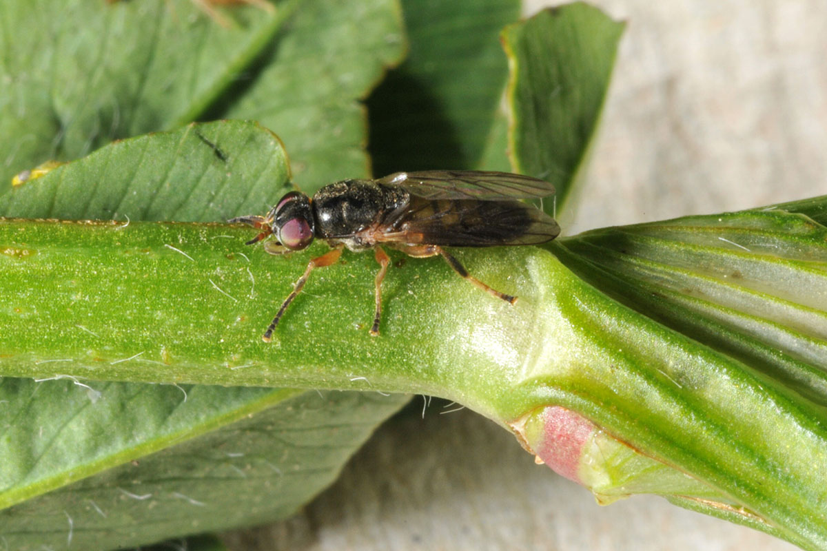 Spotted wing drosophila male fly on blackberry (dorsal view)